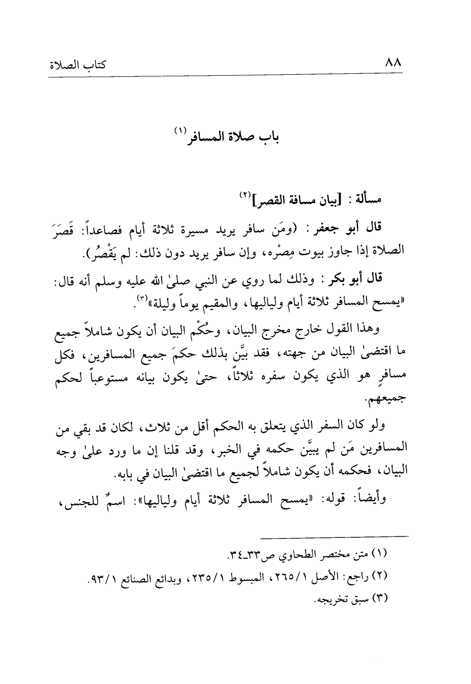 ولو كان السفر الذي يتعلق به الحكم أقل من ثلاث، لكان قد بقي من المسافرين من لم يبين حكمه في الخبر، وقد قلنا إن ما ورد على وجه البيان، فحكمه أن يكون شاملاً لجميع ما اقتضى البيان في بابه.