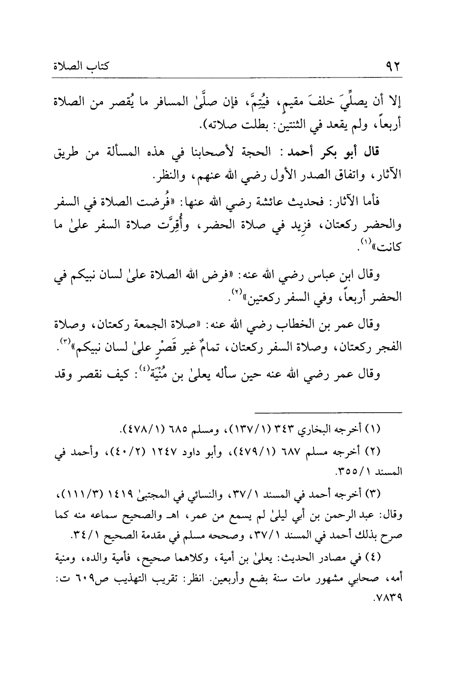 وقال عمر بن الخطاب رضي الله عنه: "صلاة الجمعة ركعتان، وصلاة الفجر ركعتان، وصلاة السفر ركعتان، تمام غير قصر على لسان نبيكم".