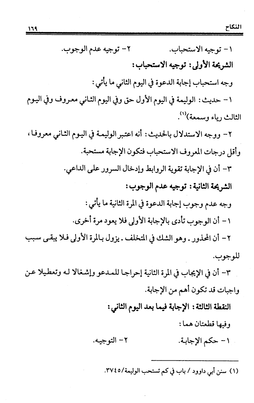2 - ووجه الاستدلال بالحديث: أنه اعتبر الوليمة في اليوم الثاني معروفا، وأقل درجات المعروف الاستحباب فتكون الإجابة مستحبة.