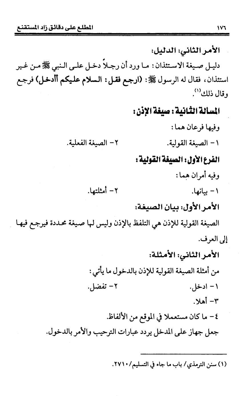 دليل صيغة الاستئذان: ما ورد أن رجلًا دخل على النبي - صلى الله عليه وسلم - من غير استئذان، فقال له الرسول - صلى الله عليه وسلم -: (ارجع فقل: السلام عليكم أأدخل) فرجع وقال ذلك (¬1).