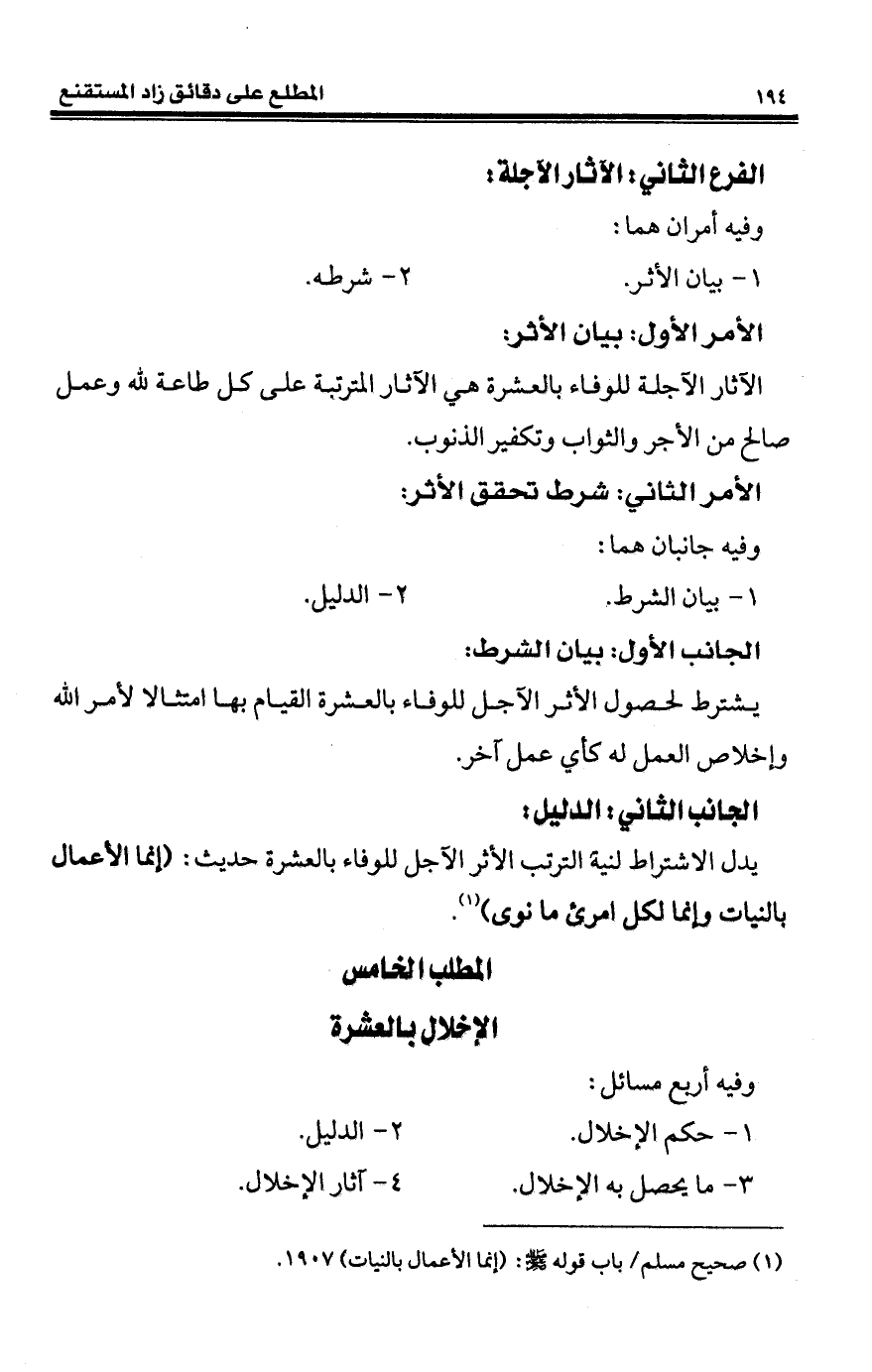 يدل الاشتراط لنية الترتب الأثر الآجل للوفاء بالعشرة حديث: (إنما الأعمال بالنيات وإنما لكل امرئ ما نوى) (¬1).