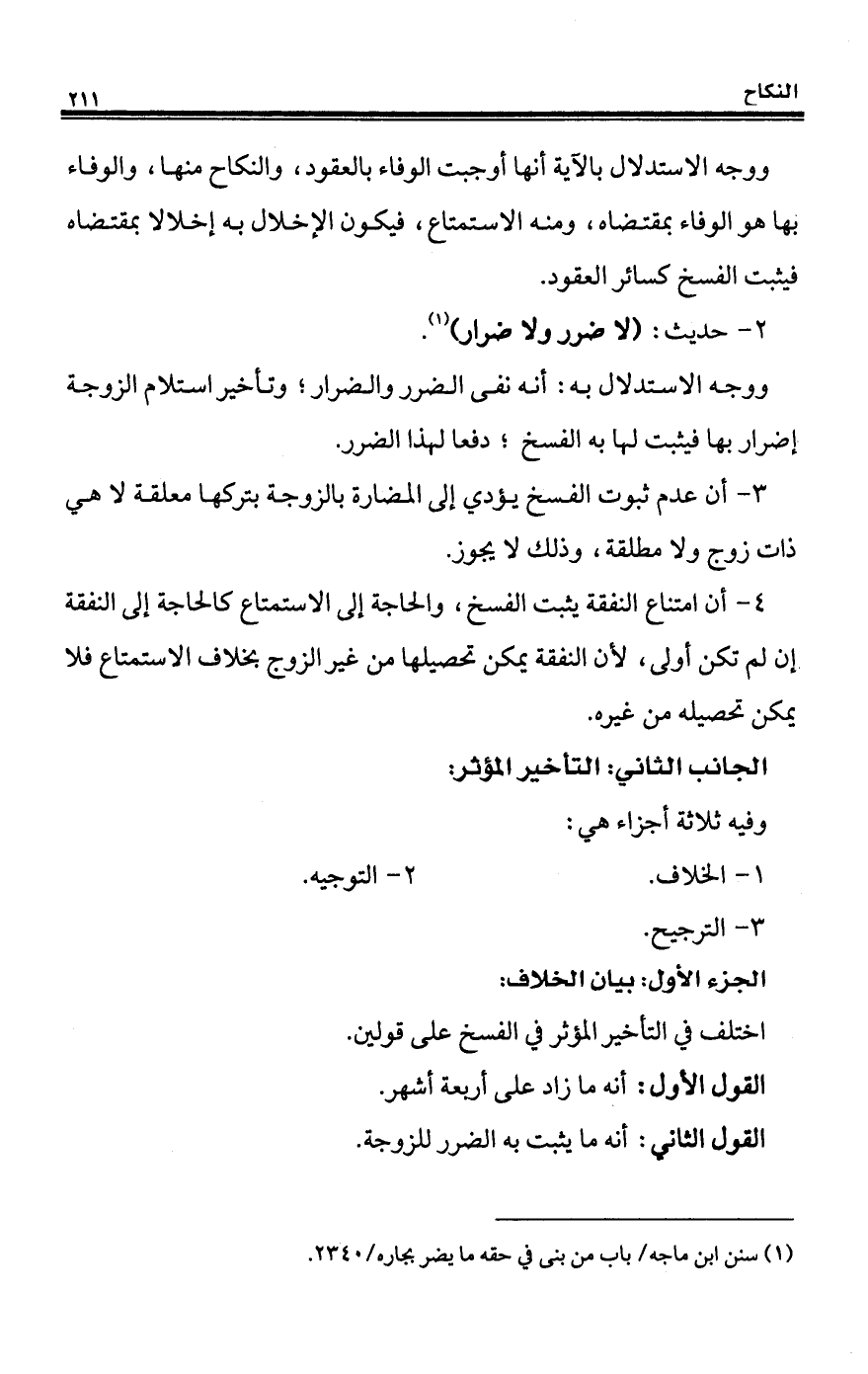 ووجه الاستدلال به: أنه نفى الضرر والضرار؛ وتأخير استلام الزوجة إضرار بها فيثبت لها به الفسخ؛ دفعا لهذا الضرر.