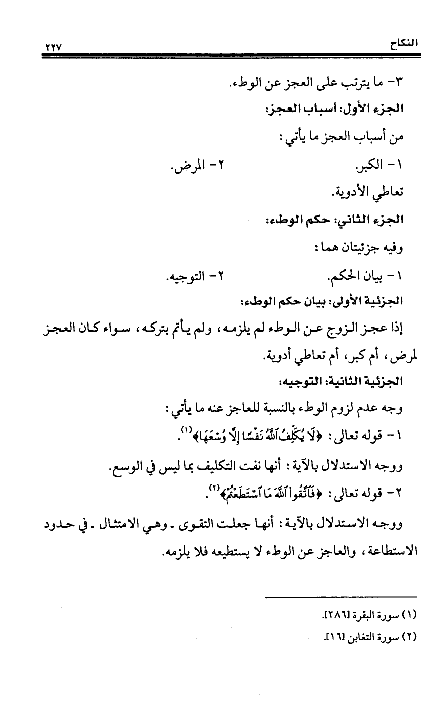ووجه الاستدلال بالآية: أنها جعلت التقوى - وهي الامتثال - في حدود الاستطاعة، والعاجز عن الوطء لا يستطيعه فلا يلزمه.