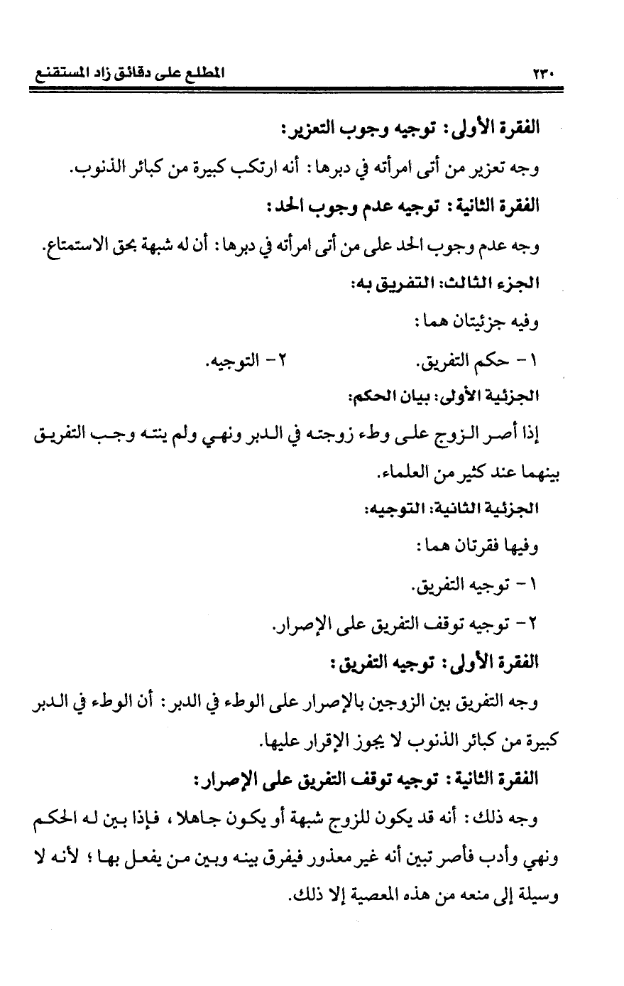 وجه ذلك: أنه قد يكون للزوج شبهة أو يكون جاهلا، فإذا بين له الحكم ونهي وأدب فأصر تبين أنه غير معذور فيفرق بينه وبين من يفعل بها؛ لأنه لا وسيلة إلى منعه من هذه المعصية إلا ذلك.