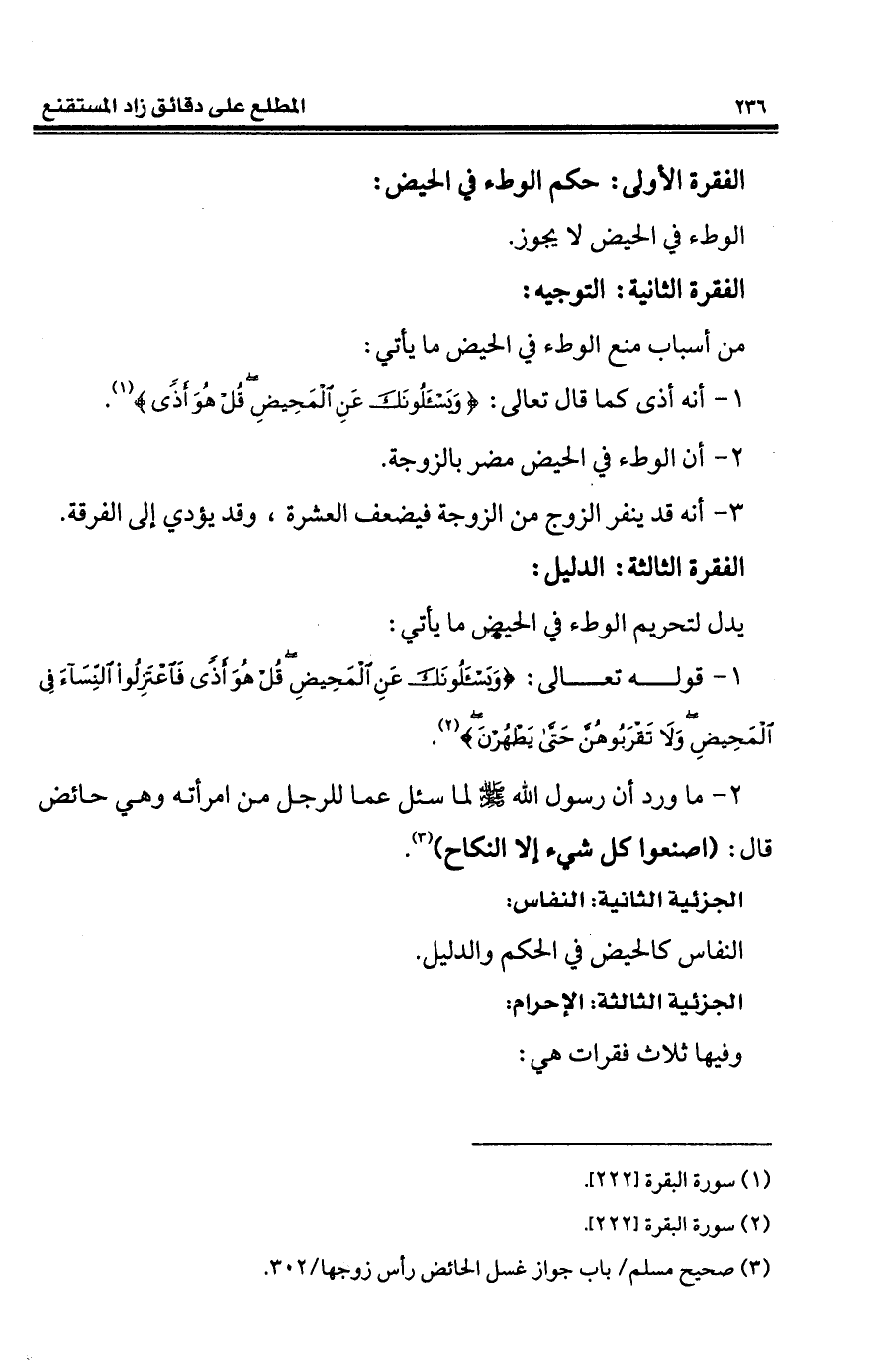 1 - قوله تعالى: {وَيَسْأَلُونَكَ عَنِ الْمَحِيضِ قُلْ هُوَ أَذًى فَاعْتَزِلُوا النِّسَاءَ فِي الْمَحِيضِ وَلَا تَقْرَبُوهُنَّ حَتَّى يَطْهُرْنَ} (¬2).