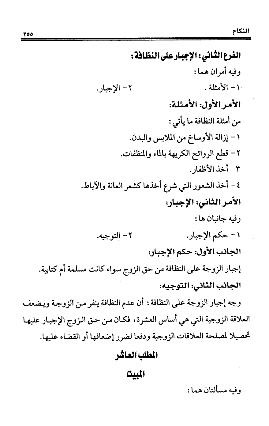 وجه إجبار الزوجة على النظافة: أن عدم النظافة ينفر من الزوجة ويضعف العلاقة الزوجية التي هي أساس العشرة، فكان من حق الزوج الإجبار عليها تحصيلا لمصلحة العلاقات الزوجية ودفعا لضرر إضعافها أو القضاء عليها.