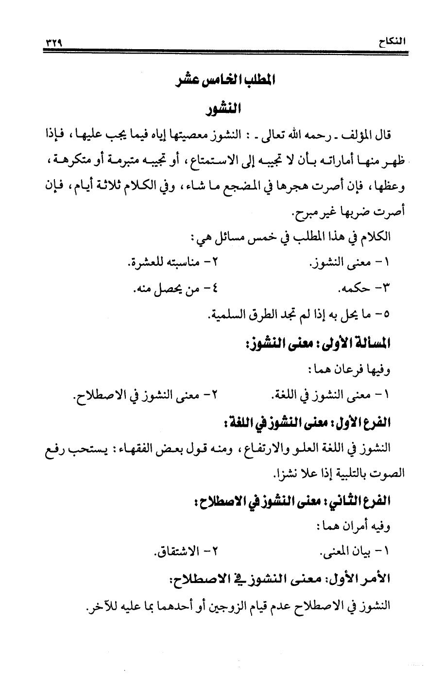 قال المؤلف - رحمه الله تعالى -: النشوز معصيتها إياه فيما يجب عليها، فإذا ظهر منها أماراته بأن لا تجيبه إلى الاستمتاع، أو تجيبه متبرمة أو متكرهة، وعظها، فإن أصرت هجرها في المضجع ما شاء، وفي الكلام ثلاثة أيام، فإن أصرت ضربها غير مبرح.