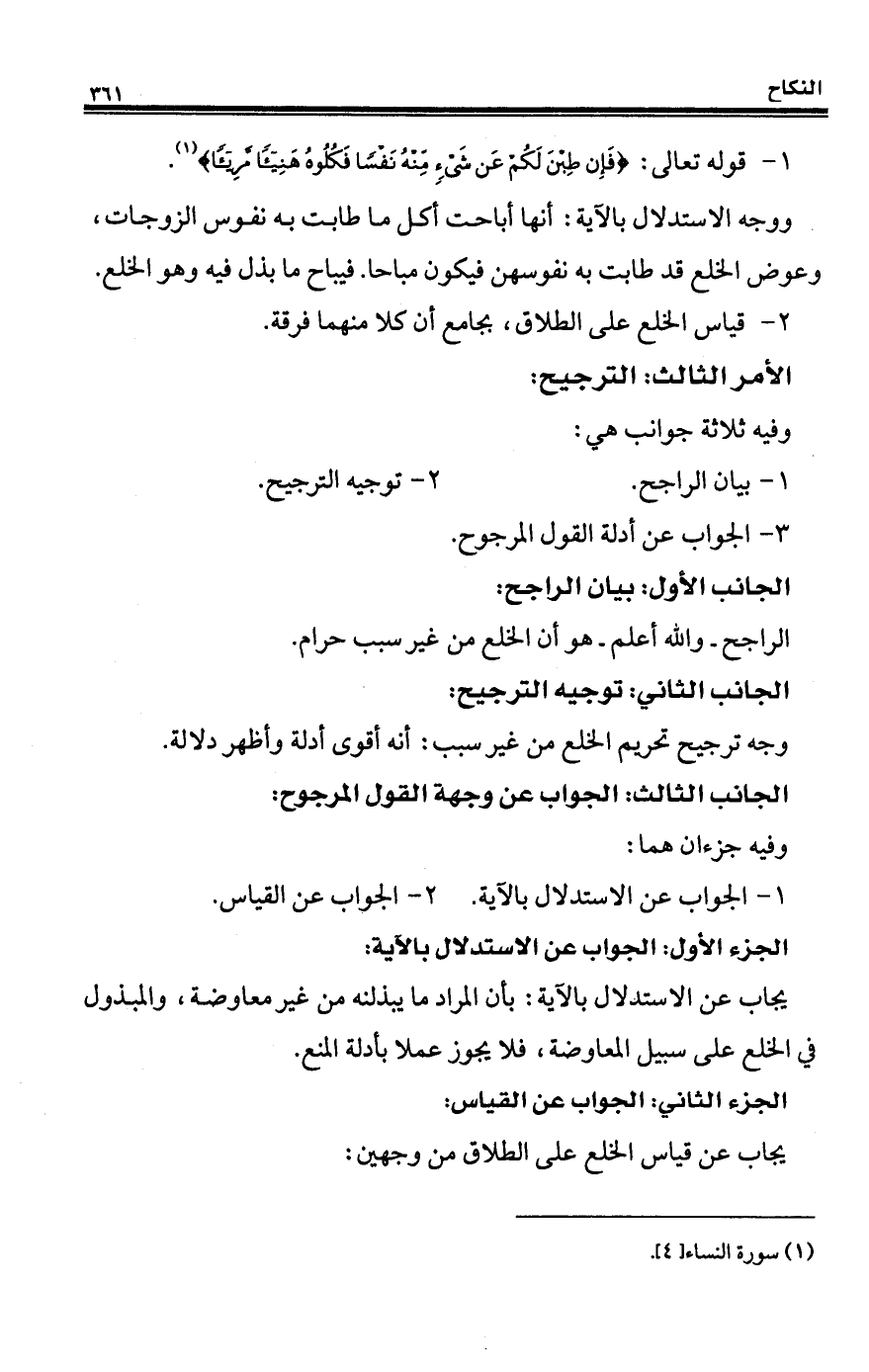 ووجه الاستدلال بالآية: أنها أباحت أكل ما طابت به نفوس الزوجات، وعوض الخلع قد طابت به نفوسهن فيكون مباحاً. فيباح ما بذل فيه وهو الخلع.