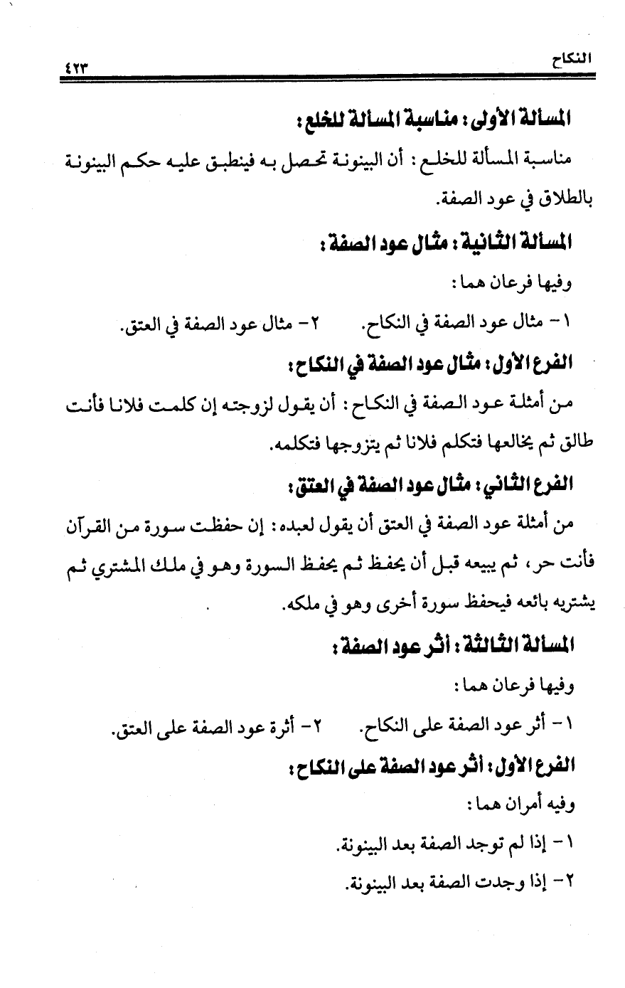 من أمثلة عود الصفة في النكاح: أن يقول لزوجته إن كلمت فلانا فأنت طالق ثم يخالعها فتكلم فلانا ثم يتزوجها فتكلمه.