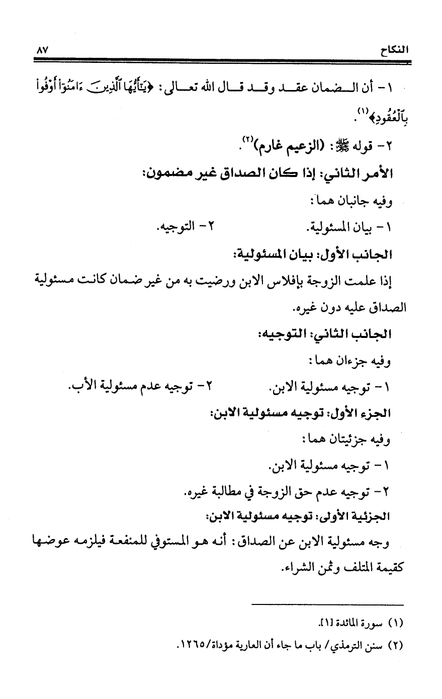 إذا علمت الزوجة بإفلاس الابن ورضيت به من غير ضمان كانت مسئولية الصداق عليه دون غيره.