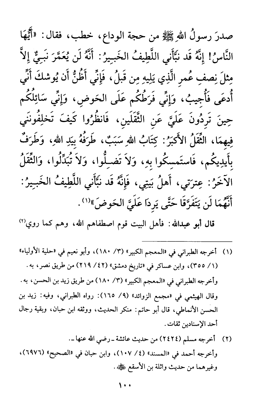 صدر رسول الله صلى الله عليه وسلم من حجة الوداع، خطب فقال: ((أيها الناس! إنه قد نبأني اللطيف الخبير: أنه لن يعمر نبيٌّ إلا مثل نصف عمر الذي يليه من قبل، فإني أظن أن يوشك أني أدعى فأجيب، وإني فرطكم على الحوض، وإني سائلكم حين تردون علي عن الثقلين، فانظروا كيف تخلفونني فيهما، الثقل الأكبر: كتاب الله سببٌ، طرفه بيد الله، وطرفٌ بأيديكم، فاستمسكوا به، ولا تضلوا، ولا تبدلوا، والثقل الآخر: عترتي، أهل بيتي، فإنه قد نبأني اللطيف الخبير: أنهما لن يتفرقا حتى يردا علي الحوض)).