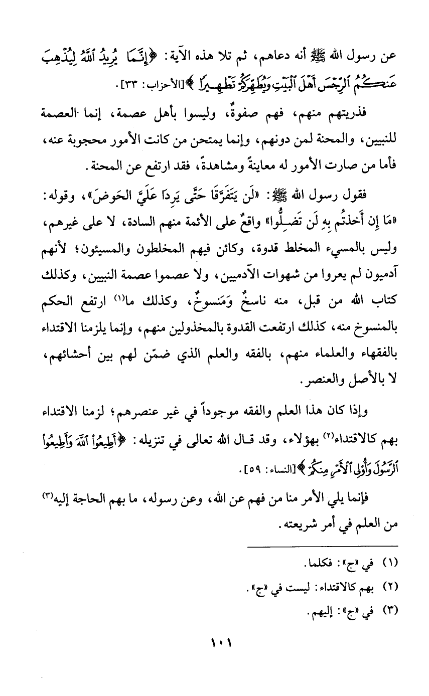 فقول رسول الله صلى الله عليه وسلم: ((لن يتفرقا حتى يردا علي الحوض))، وقوله: ((ما إن أخذتم به لن تضلوا)) واقعٌ على الأئمة منهم السادة، لا على غيرهم، وليس بالمسيء المخلط قدوة، وكائن فيهم المخلطون والمسيئون؛ لأنهم آدميون لم يعروا من شهوات الآدميين، ولا عصموا عصمة النبيين، وكذلك كتاب الله من قبل، منه ناسخٌ ومنسوخٌ، وكذلك ما ارتفع الحكم بالمنسوخ منه، كذلك ارتفعت القدوة بالمخذولين منهم، وإنما يلزمنا الاقتداء بالفقهاء والعلماء منهم، بالفقه والعلم الذي ضمن لهم بين أحشائهم، لا بالأصل والعنصر.