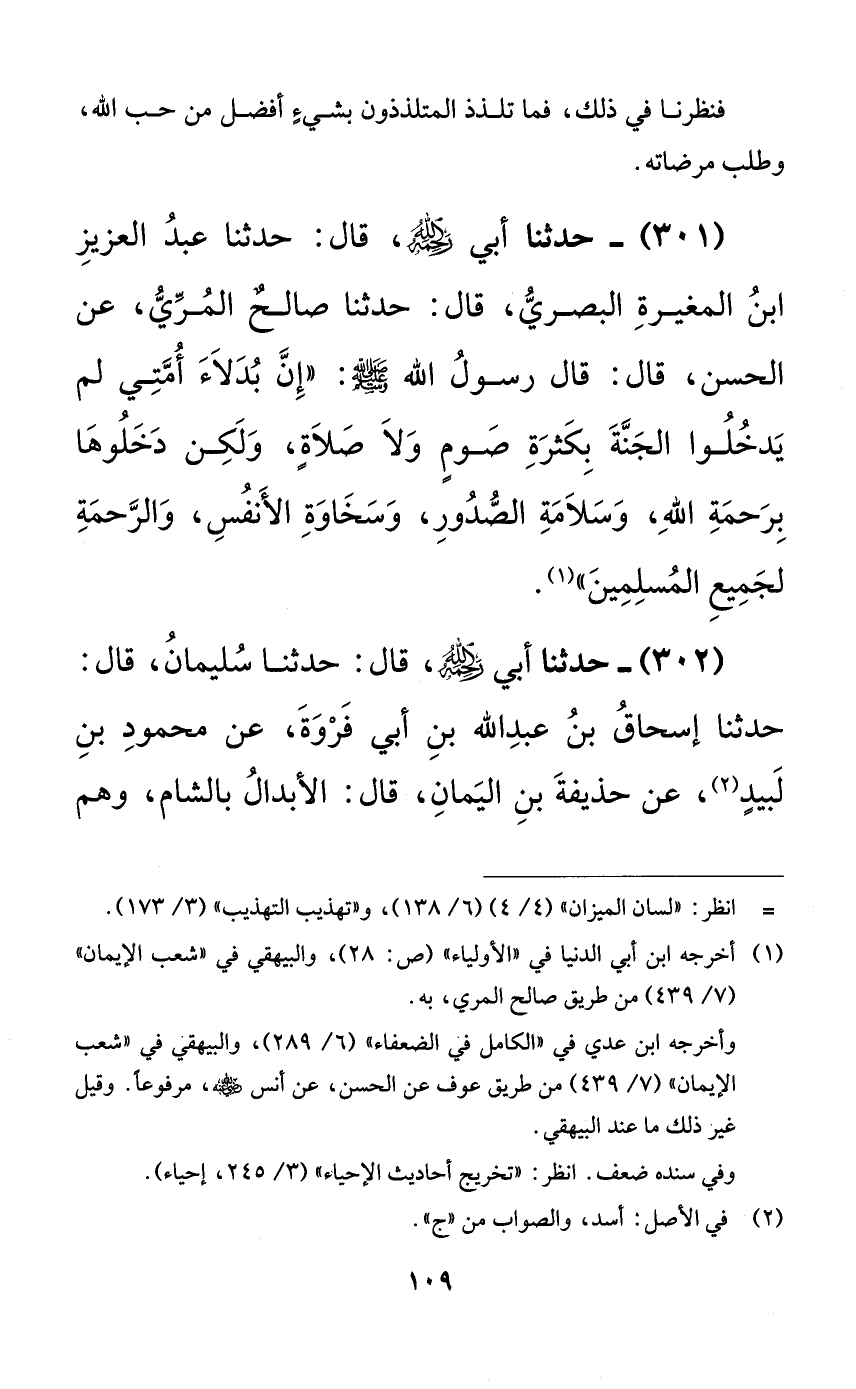 301 - حدثنا أبي رحمه الله، قال: حدثنا عبد العزيز ابن المغيرة البصري، قال: حدثنا صالحٌ المري، عن الحسن، قال: قال رسول الله صلى الله عليه وسلم: ((إن بدلاء أمتي لم يدخلوا الجنة بكثرة صومٍ ولا صلاةٍ، ولكن دخلوها برحمة الله، وسلامة الصدور، وسخاوة الأنفس، والرحمة لجميع المسلمين)).