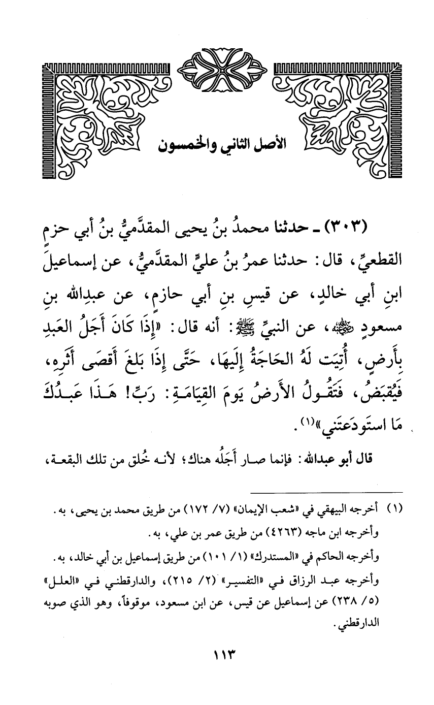 303 - حدثنا محمد بن يحيى المقدمي بن أبي حزمٍ القطعي، قال: حدثنا عمر بن علي المقدمي، عن إسماعيل ابن أبي خالدٍ، عن قيس بن أبي حازمٍ، عن عبد الله بن مسعودٍ رضي الله عنه، عن النبي صلى الله عليه وسلم: أنه قال: ((إذا كان أجل العبد بأرضٍ، أتيت له الحاجة إليها، حتى إذا بلغ أقصى أثره، فيقبض، فتقول الأرض يوم القيامة: رب! هذا عبدك ما استودعتني)).