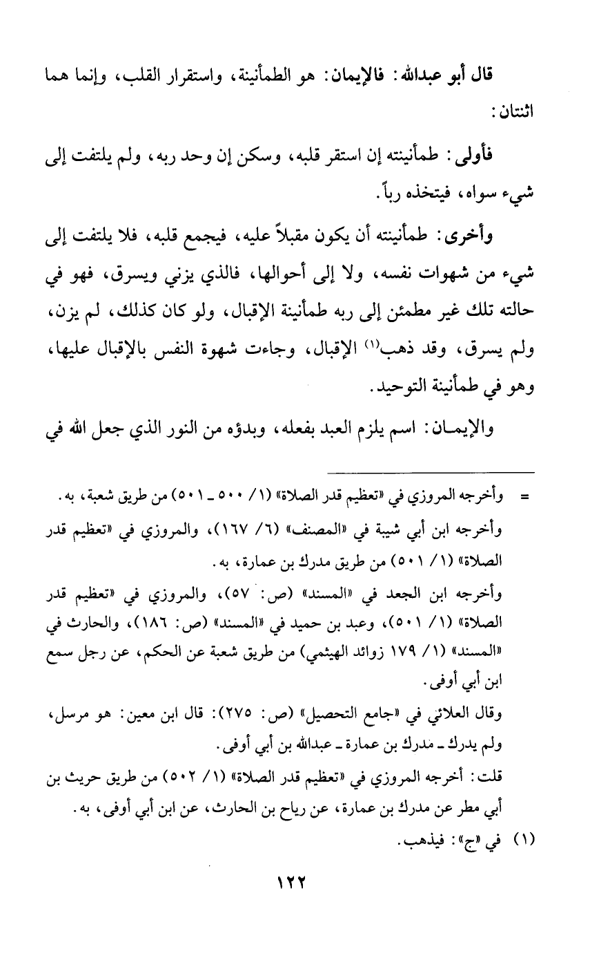 قال أبو عبد الله: فالإيمان: هو الطمأنينة، واستقرار القلب، وإنما هما اثنتان: