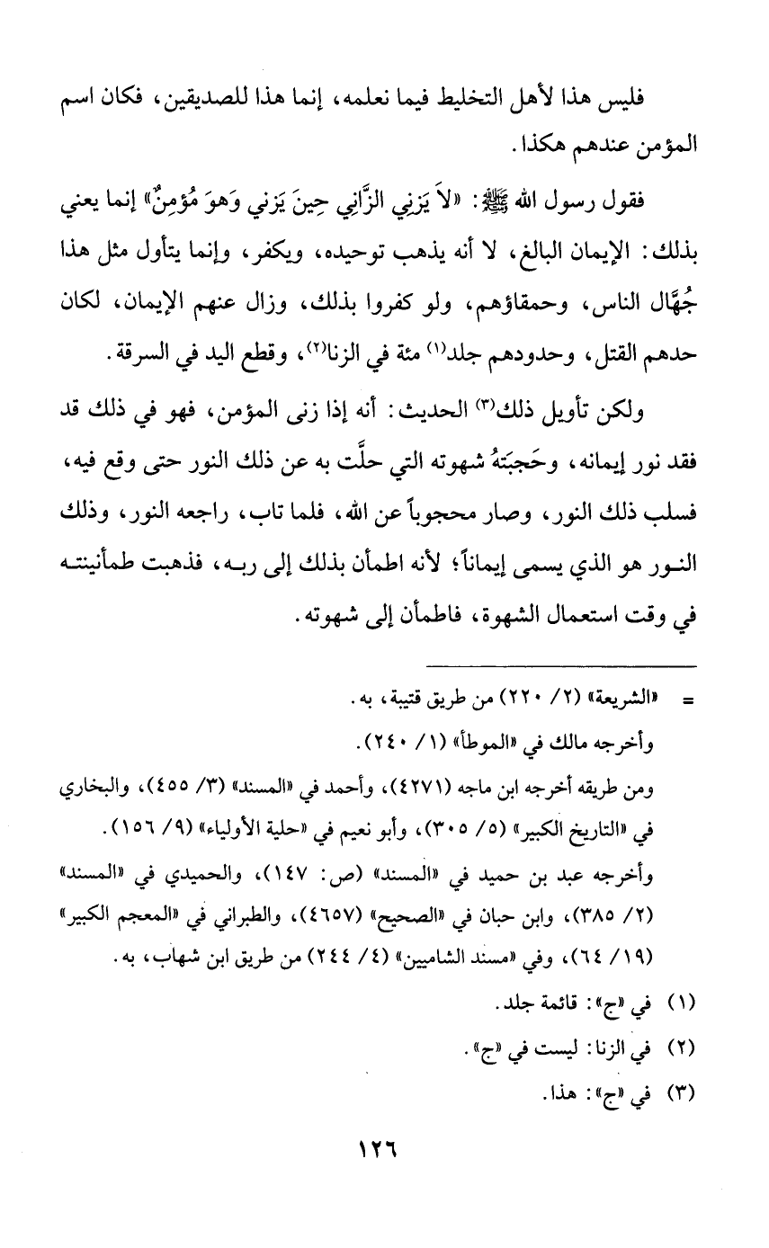 فقول رسول الله صلى الله عليه وسلم: ((لا يزني الزاني حين يزني وهو مؤمنٌ)) إنما يعني بذلك: الإيمان البالغ، لا أنه يذهب توحيده، ويكفر، وإنما يتأول مثل هذا جهال الناس، وحمقاؤهم، ولو كفروا بذلك، وزال عنهم الإيمان، لكان حدهم القتل، وحدودهم جلد مئة في الزنا، وقطع اليد في السرقة.