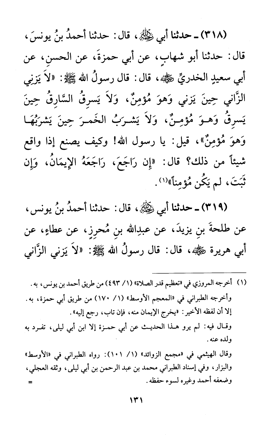 318 - حدثنا أبي رحمه الله قال: حدثنا أحمد بن يونس، قال: حدثنا أبو شهابٍ، عن أبي حمزة، عن الحسن، عن أبي سعيدٍ الخدري رضي الله عنه، قال: قال رسول الله صلى الله عليه وسلم: ((لا يزني الزاني حين يزني وهو مؤمنٌ، ولا يسرق السارق حين يسرق وهو مؤمنٌ، ولا يشرب الخمر حين يشربها وهو مؤمنٌ))، قيل: يا رسول الله! وكيف يصنع إذا واقع شيئاً من ذلك؟ قال: ((إن راجع، راجعه الإيمان، وإن ثبت، لم يكن مؤمناً)).
