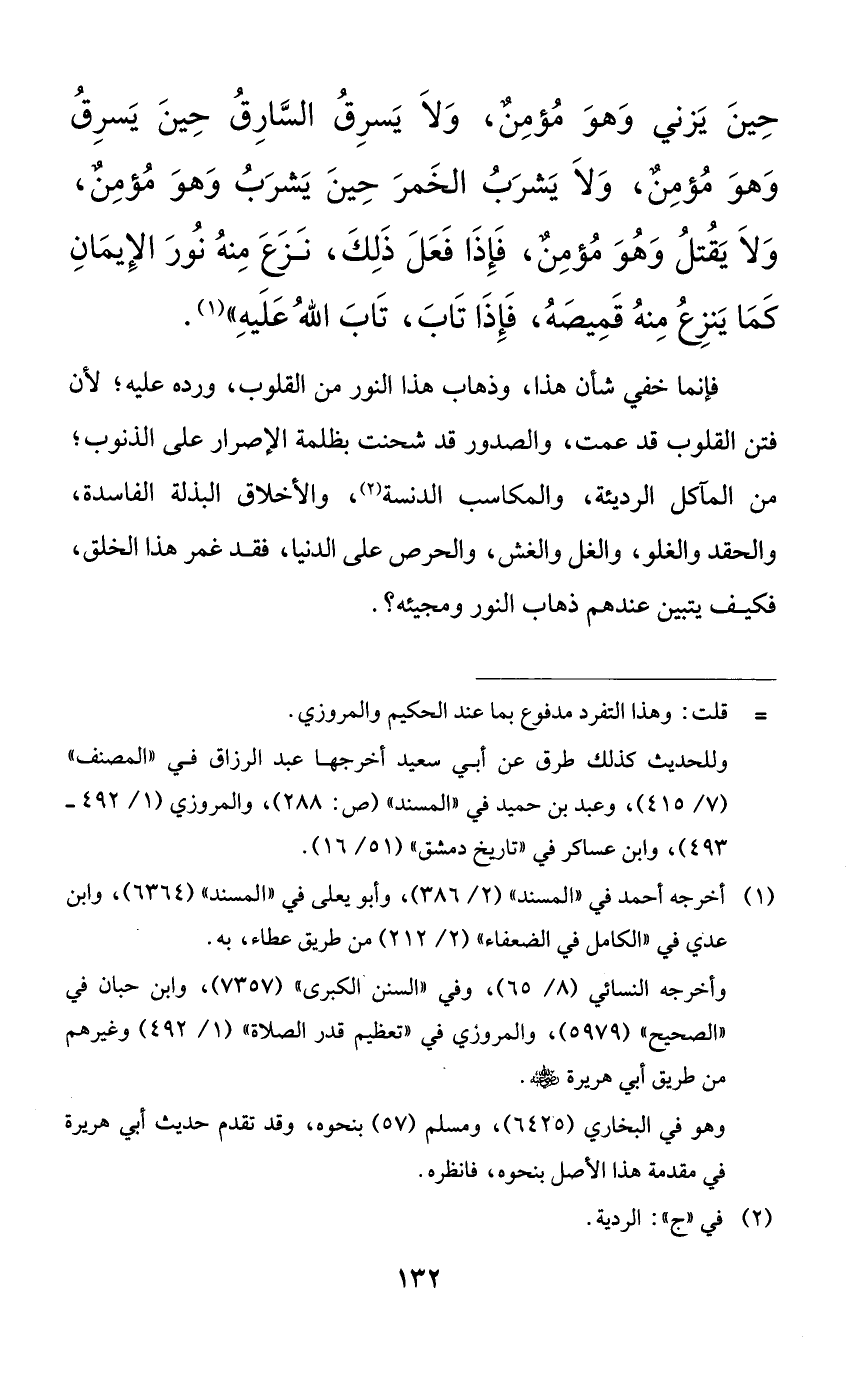 حين يزني وهو مؤمنٌ، ولا يسرق السارق حين يسرق وهو مؤمنٌ، ولا يشرب الخمر حين يشرب وهو مؤمنٌ، ولا يقتل وهو مؤمنٌ، فإذا فعل ذلك، نزع منه نور الإيمان كما ينزع منه قميصه، فإذا تاب، تاب الله عليه)).