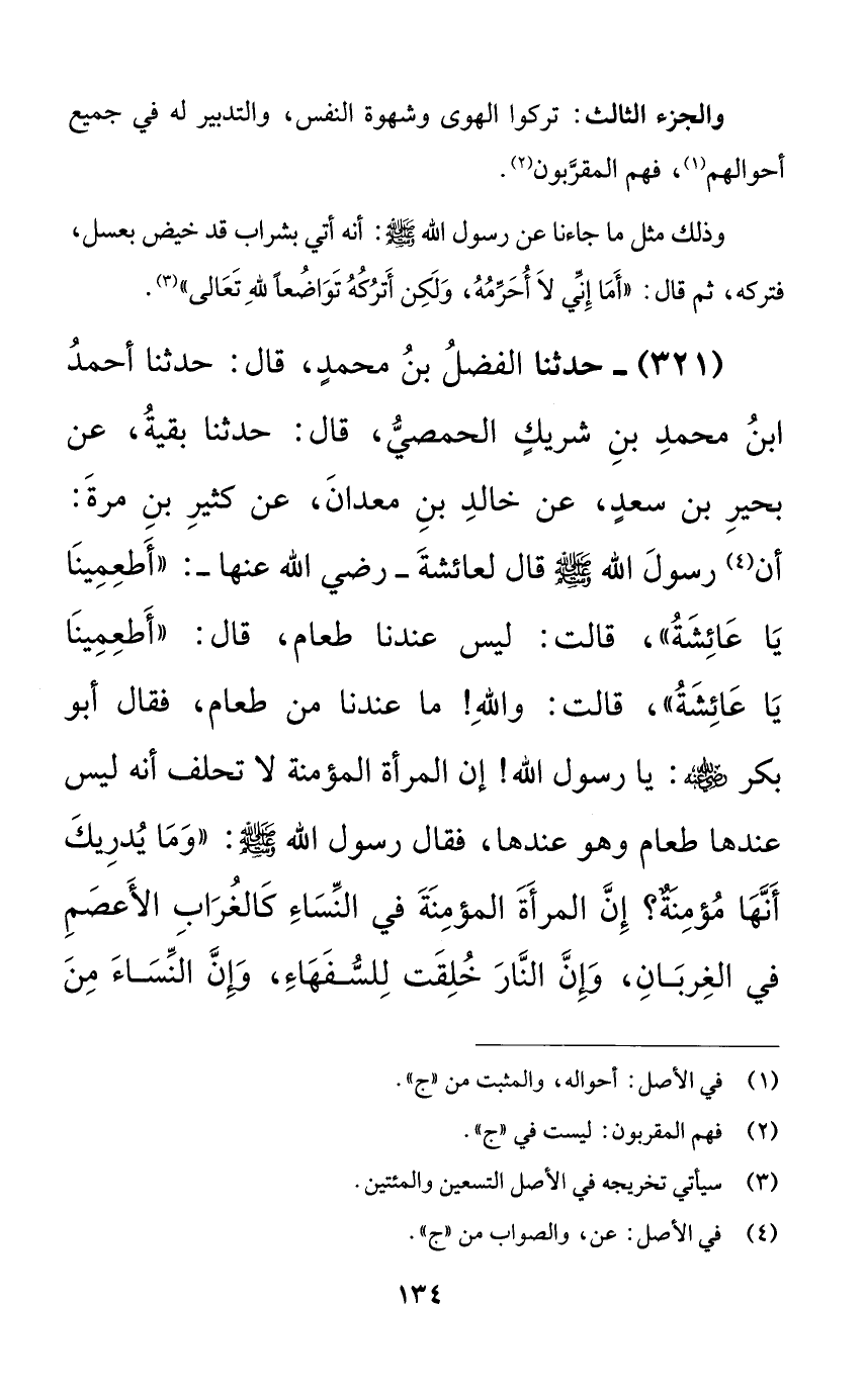 321 - حدثنا الفضل بن محمدٍ، قال: حدثنا أحمد ابن محمد بن شريكٍ الحمصي، قال: حدثنا بقية، عن بحير بن سعدٍ، عن خالد بن معدان، عن كثيرٍ بن مرة: أن رسول الله صلى الله عليه وسلم قال لعائشة -رضي الله عنها-: ((أطعمينا يا عائشة))، قالت: ليس عندنا طعام، قال: ((أطعمينا يا عائشة))، قالت: والله! ما عندنا من طعام، فقال أبو بكر رضي الله عنه: يا رسول الله! إن المرأة المؤمنة لا تحلف أنه ليس عندها طعام وهو عندها، فقال رسول الله صلى الله عليه وسلم: ((وما يدريك أنها مؤمنةٌ؟ إن المرأة المؤمنة من النساء كالغراب الأعصم في الغربان، وإن النار خلقت للسفهاء، وإن النساء من