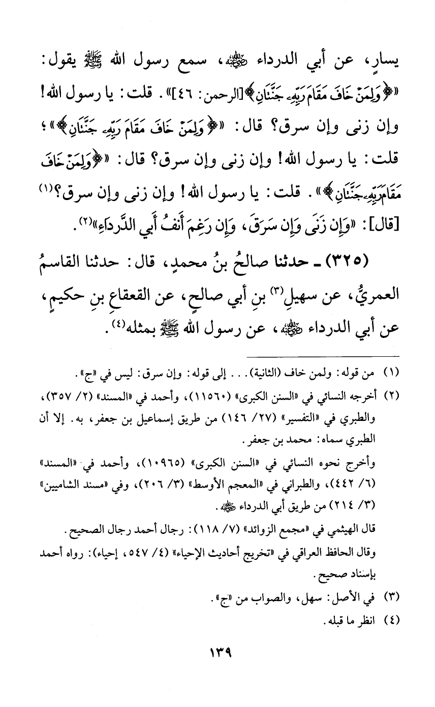 325 - حدثنا صالح بن محمدٍ، قال: حدثنا القاسم العمري، عن سهيل بن أبي صالحٍ، عن القعقاع بن حكيمٍ، عن أبي الدرداء رضي الله عنه، عن رسول الله صلى الله عليه وسلم بمثله.