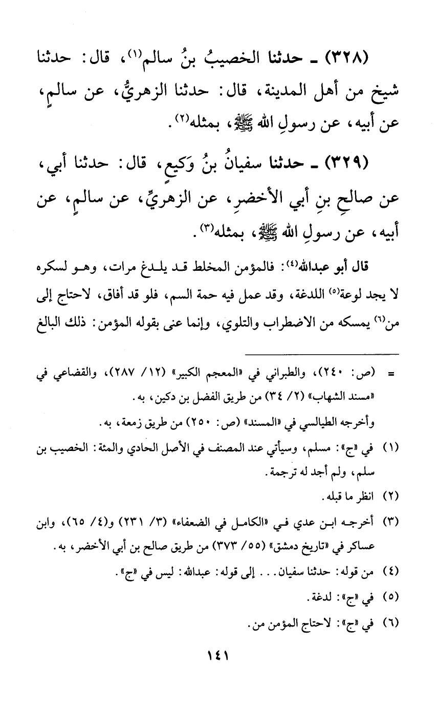 328 - حدثنا الخصيب بن سالم، قال: حدثنا شيخ من أهل المدينة، قال: حدثنا الزهري، عن سالمٍ، عن أبيه، عن رسول الله صلى الله عليه وسلم، بمثله.