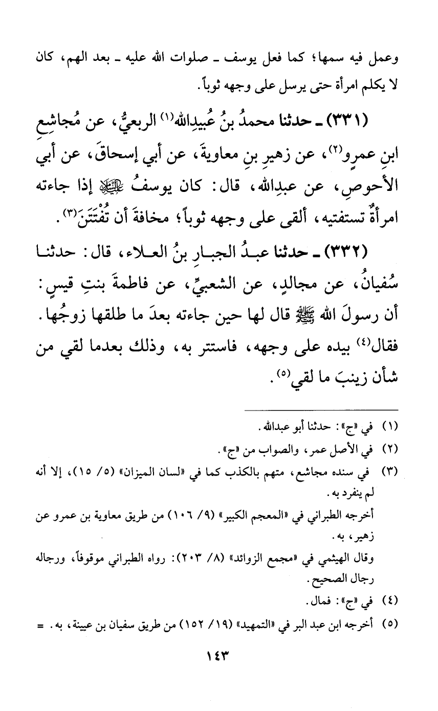 331 - حدثنا محمد بن عبيد الله الربعي، عن مجاشع ابن عمرٍو، عن زهير بن معاوية، عن أبي إسحاق، عن أبي الأحوص، عن عبد الله، قال: كان يوسف عليه السلام إذا جاءته امرأة تستفتيه، ألقى على وجهه ثوباً؛ مخافة أن تفتتن.