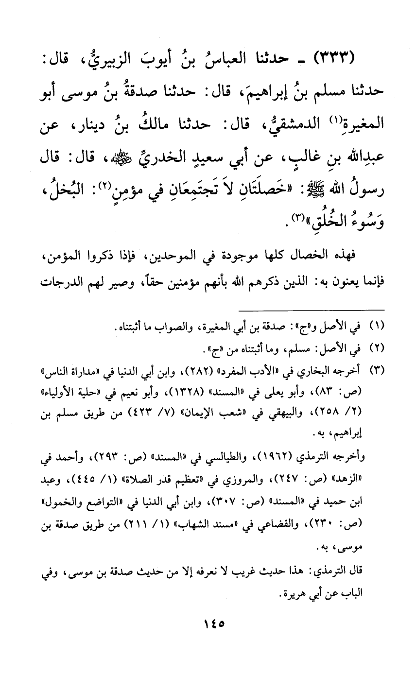 333 - حدثنا العباس بن أيوب الزبيري، قال: حدثنا مسلم بن إبراهيم، قال: حدثنا صدقة بن موسى أبو المغيرة الدمشقي، قال: حدثنا مالك بن دينار، عن عبد الله بن غالبٍ، عن أبي سعيد الخدري رضي الله عنه، قال: قال رسول الله صلى الله عليه وسلم: ((خصلتان لا تجتمعان في مؤمنٍ: البخل، وسوء الخلق)).