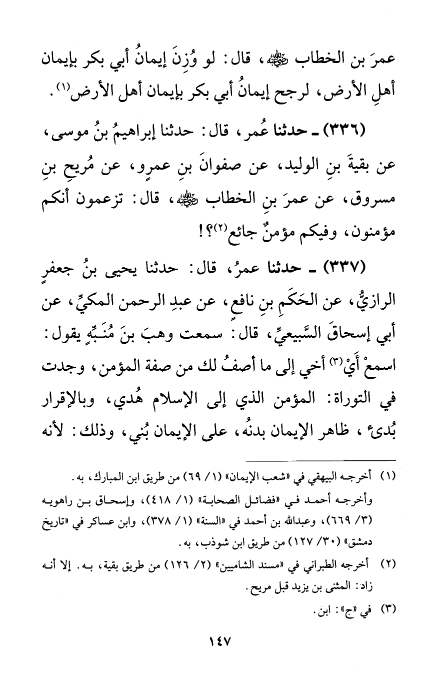337 - حدثنا عمر، قال: حدثنا يحيى بن جعفر الرازي، عن الحكم بن نافعٍ، عن عبد الرحمن المكي، عن أبي إسحاق السبيعي، قال: سمعت وهب بن منبهٍ يقول: اسمع أي أخي إلى ما أصف لك من صفة المؤمن، وجدت في التوراة: المؤمن الذي إلى الإسلام هدي، وبالإقرار بدئ، ظاهر الإيمان بدنه، على الإيمان بني، وذلك: لأنه