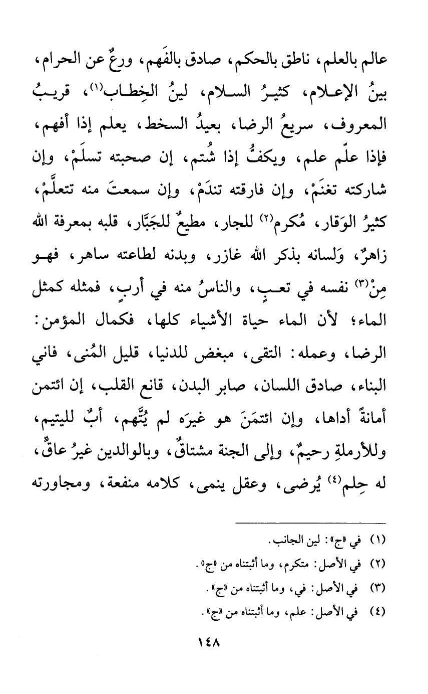 عالم بالعلم، ناطق بالحكم، صادق بالفهم، ورعٌ عن الحرام، بين الإعلام، كثير السلام، لين الخطاب، قريب المعروف، سريع الرضا، بعيد السخط، يعلم إذا أفهم، فإذا علّم علم، ويكف إذا شتم، إن صحبته تسلم، وإن شاركته تغنم، وإن فارقته تندم، وإن سمعت منه تتعلم، كثير الوقار، مكرم للجار، مطيعٌ للجبار، قلبه بمعرفة الله زاهرٌ، ولسانه بذكر الله غازر، وبدنه لطاعته ساهر، فهو من نفسه في تعبٍ، والناس منه في أربٍ، فمثله كمثل الماء؛ لأن الماء حياة الأشياء كلها، فكمال المؤمن، الرضا، وعمله، التقى، مبغض للدنيا، قليل المنى، فاني البناء، صادق اللسان، صابر البدن، قانع القلب، إن ائتمن أمانةً أداها، وإن ائتمن هو غيره لم يتهم، أبٌ لليتيم، وللأرملة رحيمٌ، وإلى الجنة مشتاقٌ، وبالوالدين غير عاق، له حلم يرضى، وعقل ينمى، كلامه منفعة، ومجاورته