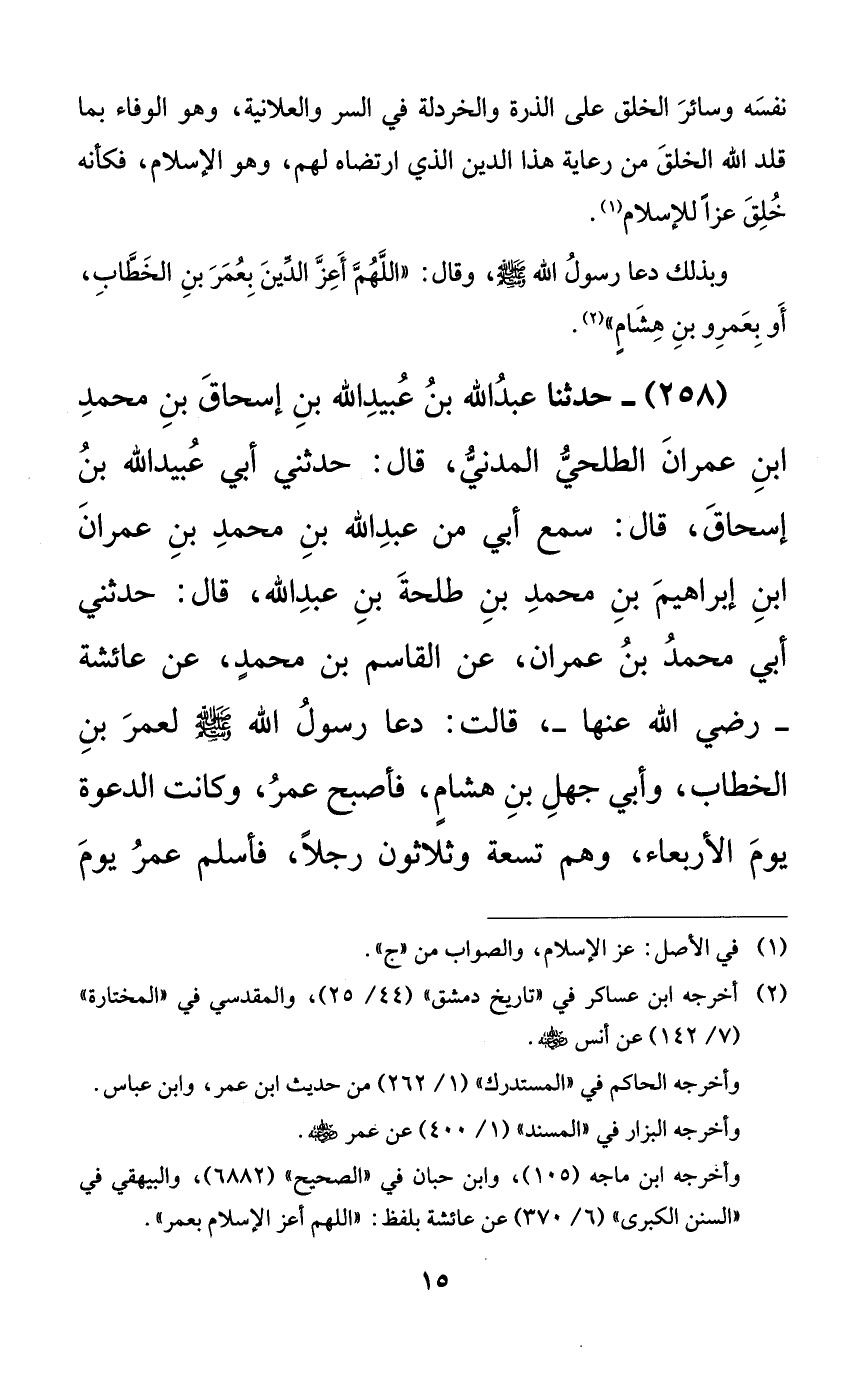 258 - حدثنا عبد الله بن عبيد الله بن إسحاق بن محمد ابن عمران الطلحي المدني، قال: حدثني أبي عبيد الله بن إسحاق، قال: سمع أبي من عبد الله بن محمد بن عمران ابن إبراهيم بن محمد بن طلحة بن عبد الله، قال: حدثني أبي محمد بن عمران، عن القاسم بن محمد عن عائشة -رضي الله عنها-، قالت: دعا رسول الله صلى الله عليه وسلم لعمر بن الخطاب، وأبي جهل بن هشامٍ، فأصبح عمر، وكانت الدعوة يوم الأربعاء، وهم تسعة وثلاثون رجلاً، فأسلم عمر يوم