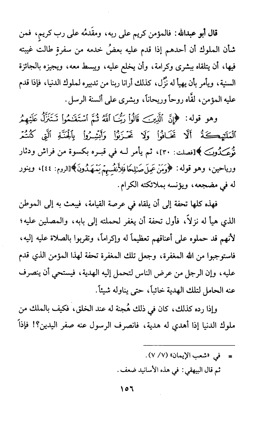 قال أبو عبد الله: فالمؤمن كريم على ربه، ومقدمه على رب كريمٍ، فمن شأن الملوك أن أحدهم إذا قدم عليه بعض خدمه من سفرةٍ طالت غيبته فيها، أن يتلقاه ببشرى وكرامة، وأن يخلع عليه، ويبسط معه، ويجيزه بالجائزة السنية، ويأمر بأن يهيأ له نزل، كذلك أرانا ربنا من تدبيره لملوك الدنيا، فإذا قدم عليه المؤمن، لقاه روحاً وريحاناً، وبشرى على ألسنة الرسل.