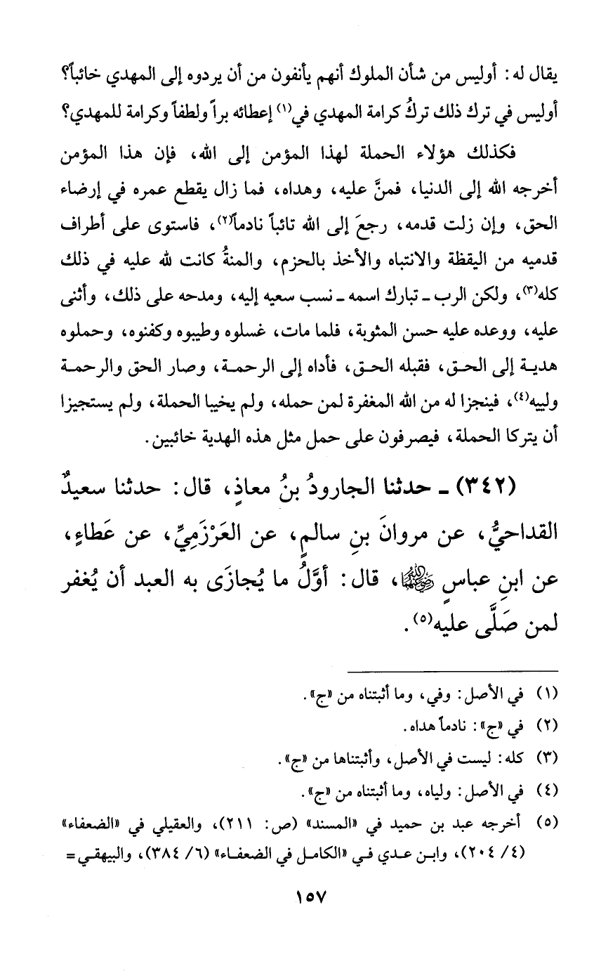 342 - حدثنا الجارود بن معاذٍ، قال: حدثنا سعيدٌ القداحي، عن مروان بن سالمٍ، عن العرزمي، عن عطاءٍ، عن ابن عباسٍ رضي الله عنهما، قال: أول ما يجازى به العبد أن يغفر لمن صلى عليه.