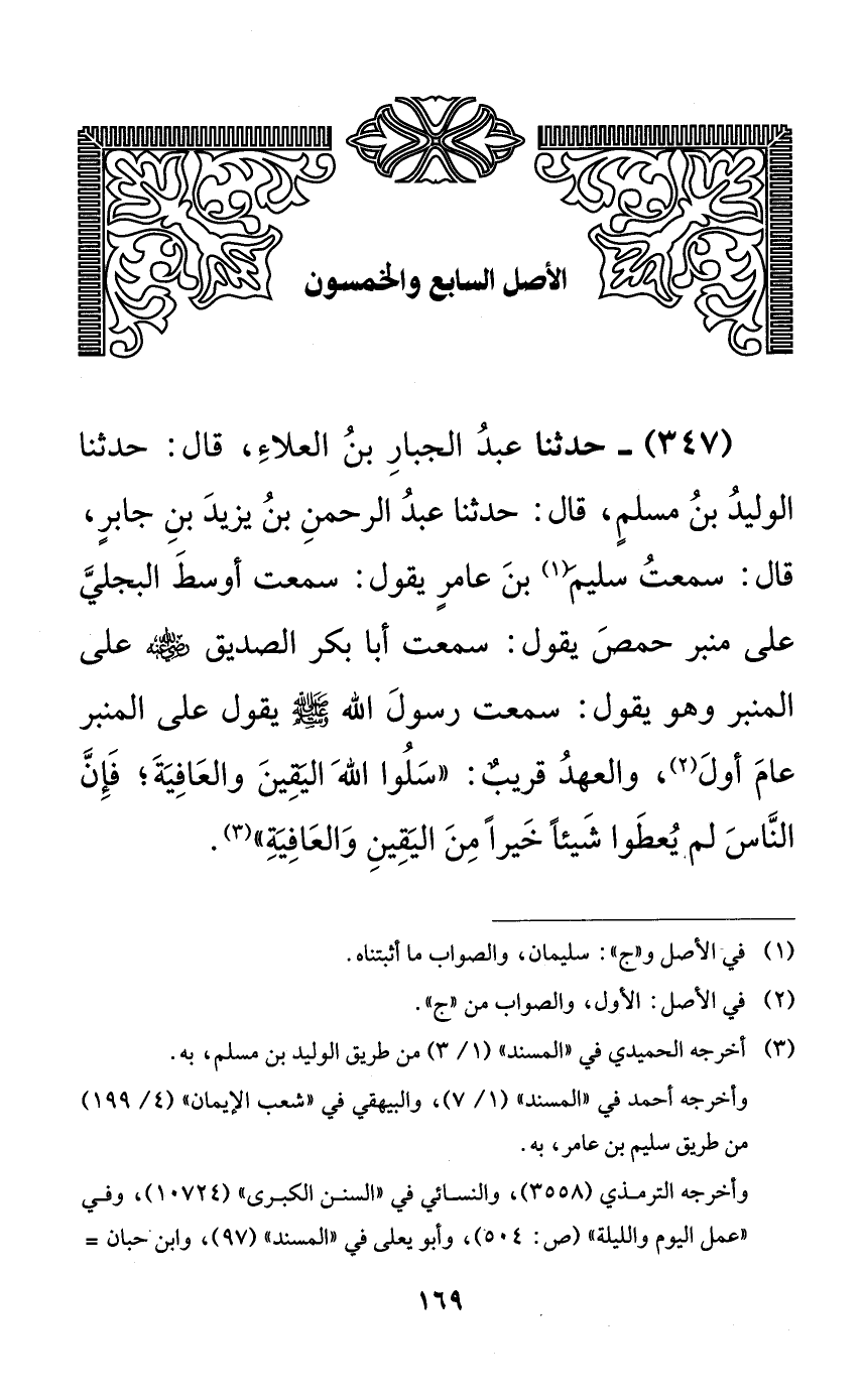 347 - حدثنا عبد الجبار بن العلاء، قال: حدثنا الوليد بن مسلمٍ، قال: حدثنا عبد الرحمن بن يزيد بن جابرٍ، قال: سمعت سليم بن عامرٍ يقول: سمعت أوسط البجلي على منبر حمص يقول: سمعت أبا بكر الصديق رضي الله عنه على المنبر وهو يقول: سمعت رسول الله صلى الله عليه وسلم يقول على المنبر عام أول، والعهد قريبٌ: ((سلوا الله اليقين والعافية؛ فإن الناس لم يعطوا شيئاً خيراً من اليقين والعافية)).