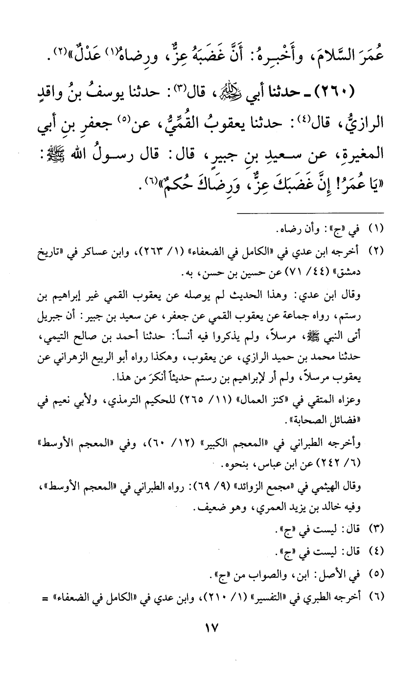 260 - حدثنا أبي رحمه الله، قال: حدثنا يوسف بن واقدٍ الرازي، قال: حدثنا يعقوب القمي، عن جعفر بن أبي المغيرة، عن سعيد بن جبيرٍ، قال: قال رسول الله صلى الله عليه وسلم: ((يا عمر! إن غضبك عزٌّ، ورضاك حكمٌ)).