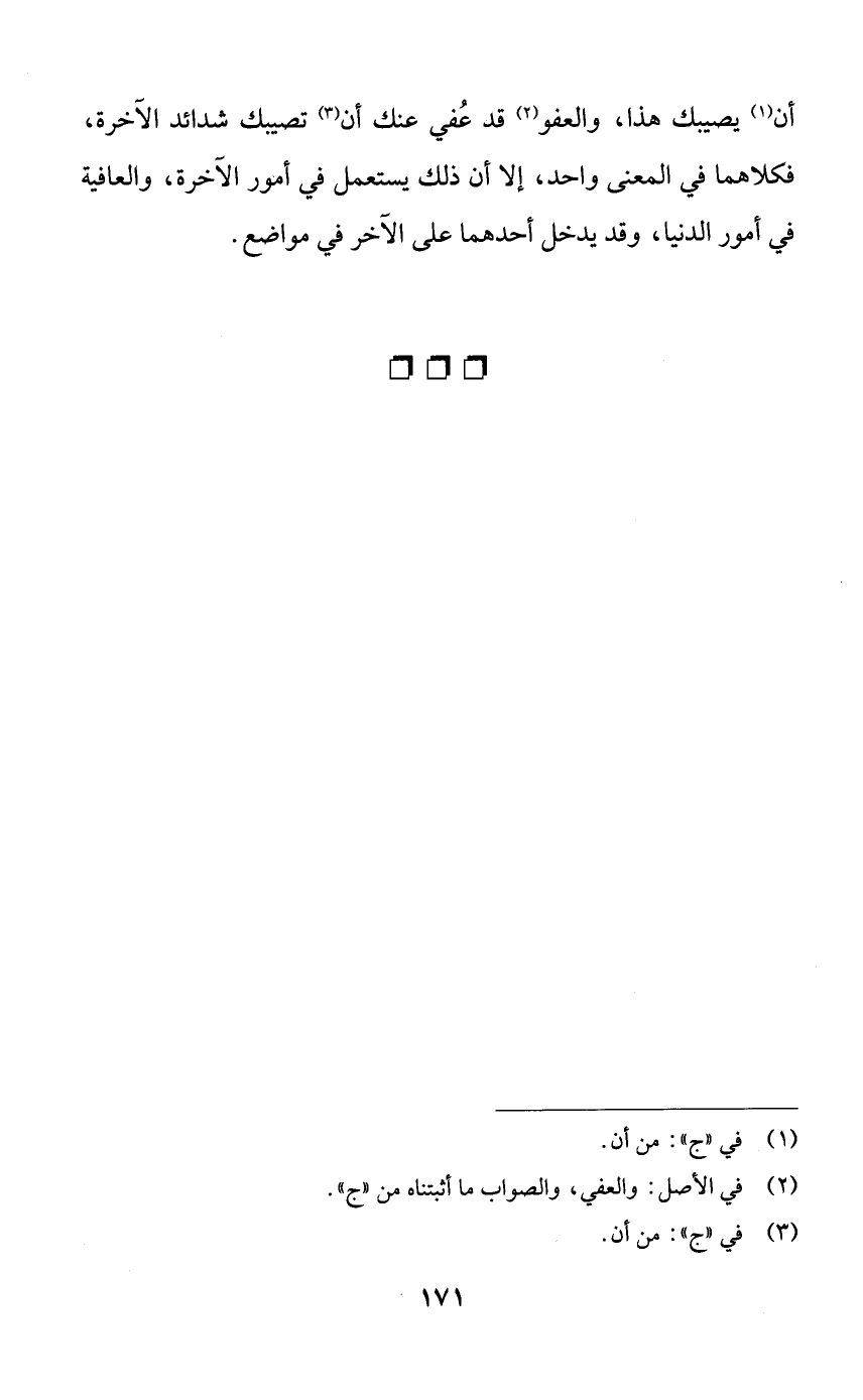 أن يصيبك هذا، والعفو قد عفي عنك أن تصيبك شدائد الآخرة، فكلاهما في المعنى واحد، إلا أن ذلك يستعمل في أمور الآخرة، والعافية في أمور الدنيا، وقد يدخل أحدهما على الآخر في مواضع.