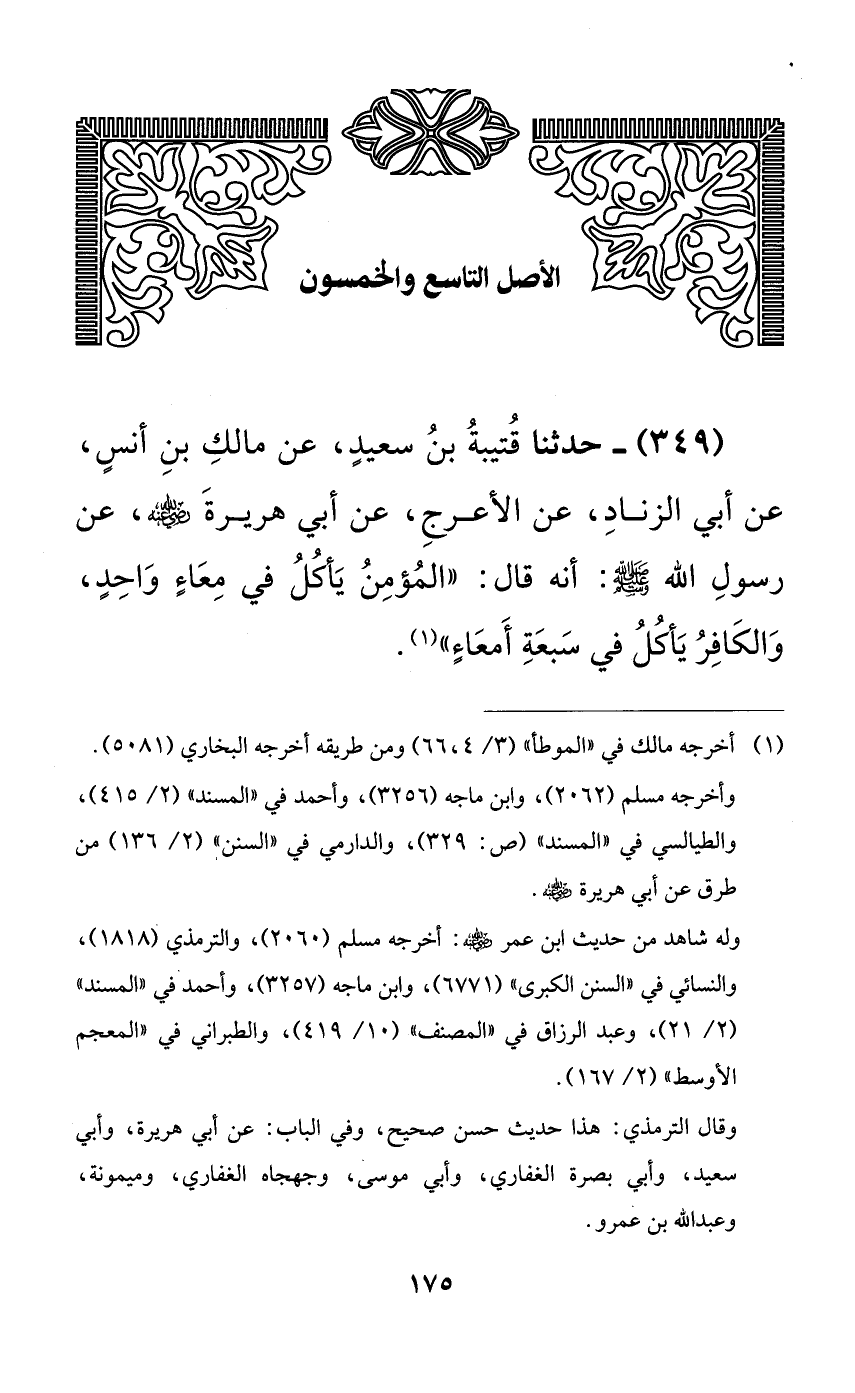 349 - حدثنا قتيبة بن سعيدٍ، عن مالك بن أنسٍ، عن أبي الزناد، عن الأعرج، عن أبي هريرة رضي الله عنه، عن رسول الله صلى الله عليه وسلم أنه قال: ((المؤمن يأكل في معاءٍ واحدٍ، والكافر يأكل في سبعة أمعاءٍ)).