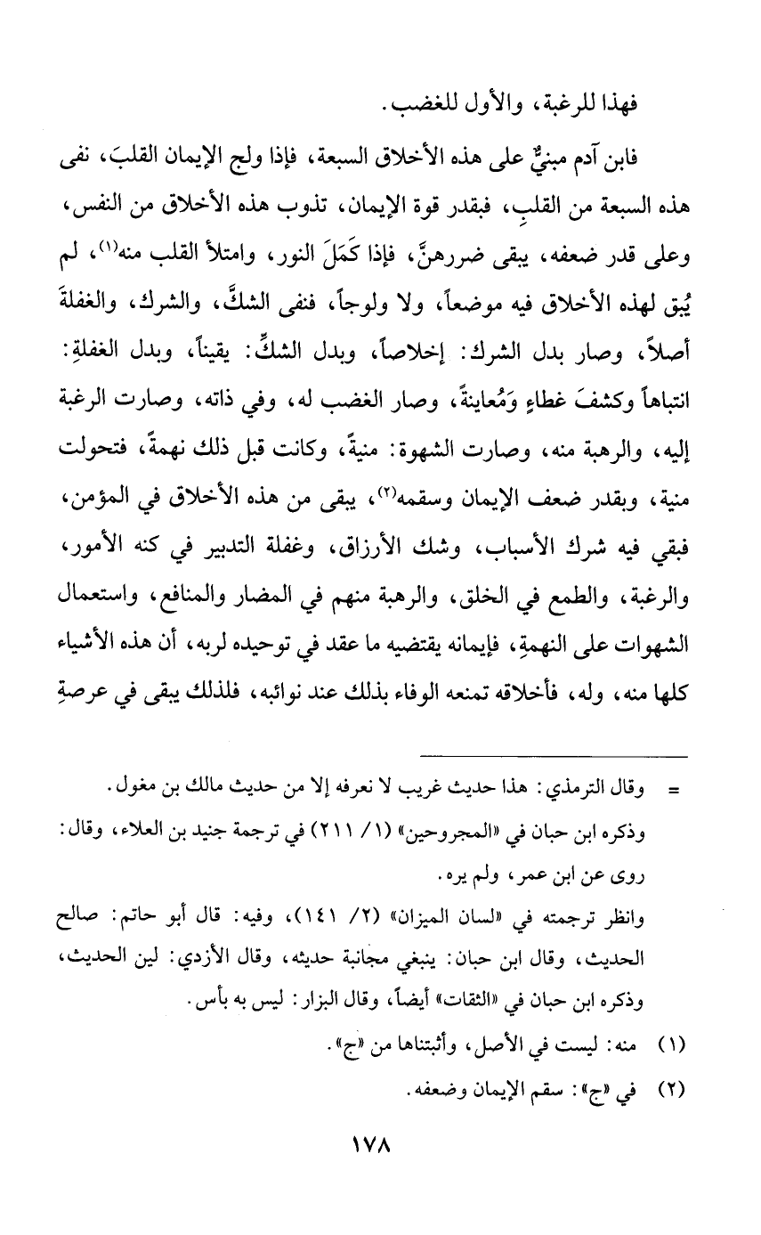 فابن آدم مبنيٌّ على هذه الأخلاق السبعة، فإذا ولج الإيمان القلب، نفى هذه السبعة من القلب، فبقدر قوة الإيمان، تذوب هذه الأخلاق من النفس، وعلى قدر ضعفه، يبقى ضررهن، فإذا كمل النور، وامتلأ القلب منه، لم يبق لهذه الأخلاق فيه موضعاً، ولا ولوجاً، فنفى الشك، والشرك، والغفلة أصلاً، وصار بدل الشرك: إخلاصاً، وبدل الشك: يقيناً، وبدل الغفلة: انتباهاً وكشف غطاءٍ ومعاينةً، وصار الغضب له، وفي ذاته، وصارت الرغبة إليه، والرهبة منه، وصارت الشهوة: منيةً، وكانت قبل ذلك نهمةً، فتحولت منية، وبقدر ضعف الإيمان وسقمه، يبقى من هذه الأخلاق في المؤمن، فبقي فيه شرك الأسباب، وشك الأرزاق، وغفلة التدبير في كنه الأمور، والرغبة، والطمع في الخلق، والرهبة منهم في المضار والمنافع، واستعمال الشهوات على النهمة، فإيمانه يقتضيه ما عقد في توحيده لربه، أن هذه الأشياء كلها منه، وله، فأخلاقه تمنعه الوفاء بذلك عند نوائبه، فلذلك يبقى في عرصة