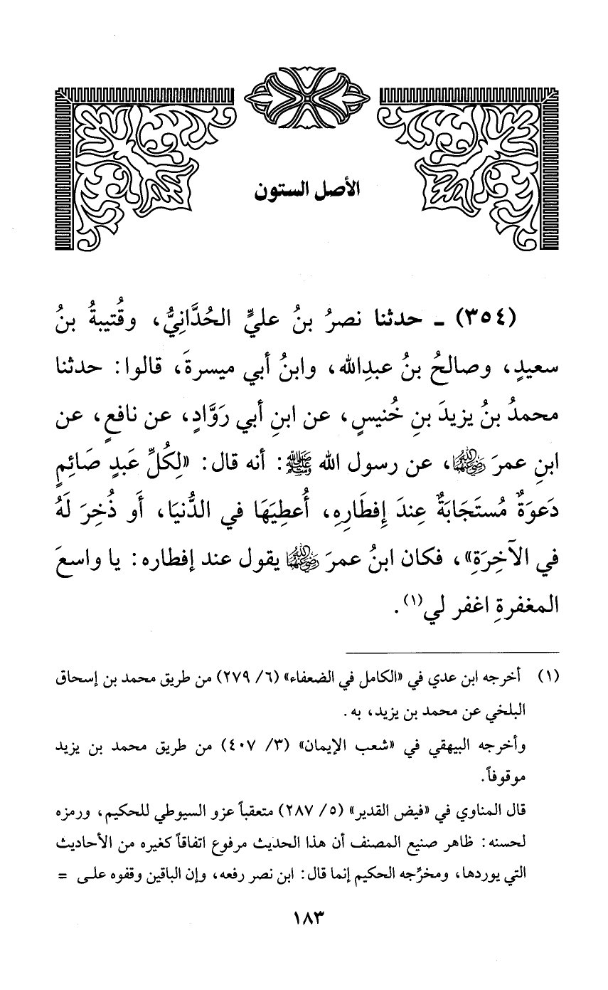 354 - حدثنا نصر بن علي الحداني، وقتيبة بن سعيدٍ، وصالح بن عبد الله، وابن أبي ميسرة، قالوا: حدثنا محمد بن يزيد بن خنيسٍ، عن ابن أبي روادٍ، عن نافعٍ، عن ابن عمر رضي الله عنهما، عن رسول الله صلى الله عليه وسلم: أنه قال: ((لكل عبدٍ صائمٍ دعوةٌ مستجابةٌ عند إفطاره، أعطيها في الدنيا، أو ذخر له في الآخرة))، فكان ابن عمر رضي الله عنهما يقول عند إفطاره: يا واسع المغفرة اغفر لي.