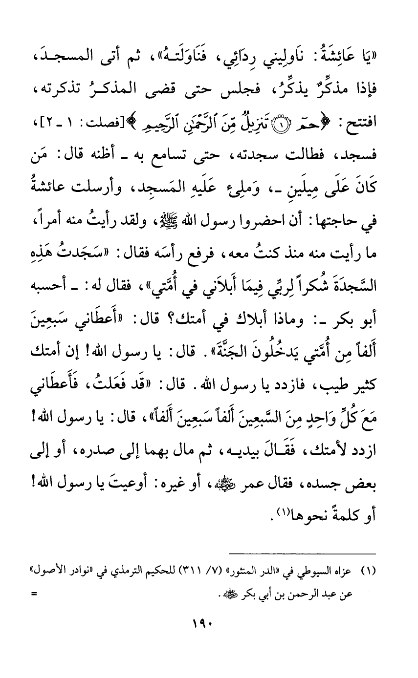 ((يا عائشة: ناوليني ردائي، فناولته))، ثم أتى المسجد، فإذا مذكرٌ يذكر، فجلس حتى قضى المذكر تذكرته، افتتح: {حم. تنزيلٌ من الرحمن الرحيم}، فسجد، فطالت سجدته، حتى تسامع به -أظنه قال: من كان على ميلين-، وملئ عليه المسجد، وأرسلت عائشة في حاجتها، أن احضروا رسول الله صلى الله عليه وسلم، ولقد رأيت منه أمراً، ما رأيت منه منذ كنت معه، فرفع رأسه فقال: ((سجدت هذه السجدة شكراً لربي فيما أبلاني في أمتي))، فقال له: -أحسبه أبو بكر-: وماذا أبلاك في أمتك؟ قال: ((أعطاني سبعين ألفاً من أمتي يدخلون الجنة)). قال: يا رسول الله! إن أمتك كثير طيب، فازدد يا رسول الله. قال: ((قد فعلت، فأعطاني مع كل واحدٍ من السبعين ألفاً سبعين ألفاً))، قال: يا رسول الله! ازدد لأمتك، فقال بيديه، ثم مال بهما إلى صدره، أو إلى بعض جسده، فقال عمر رضي الله عنه، أو غيره: أوعيت يا رسول الله! أو كلمة نحوها.