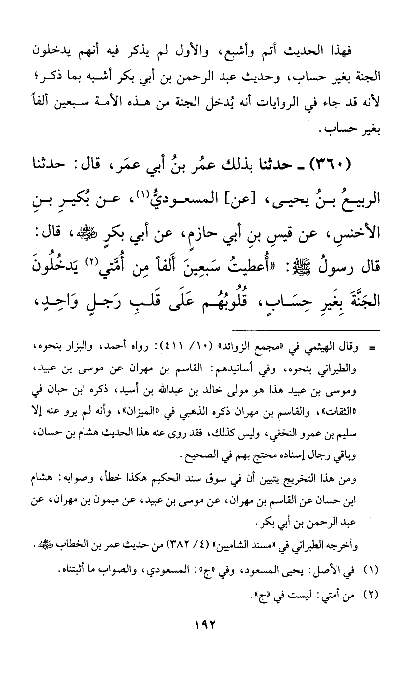 360 - حدثنا بذلك عمر بن أبي عمر، قال: حدثنا الربيع بن يحيى، [عن] المسعودي، عن بكير بن الأخنس، عن قيس بن أبي حازمٍ، عن أبي بكرٍ رضي الله عنه، قال: قال رسول الله صلى الله عليه وسلم: ((أعطيت سبعين ألفاً من أمتي يدخلون الجنة بغير حسابٍ، قلوبهم على قلب رجلٍ واحدٍ،