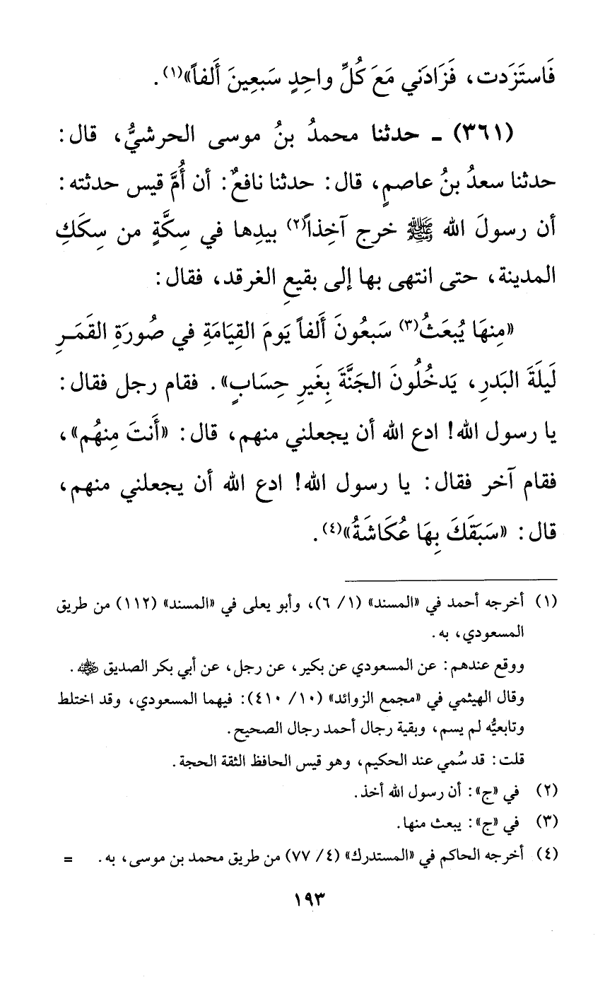 ((منها يبعث سبعون ألفاً يوم القيامة في صورة القمر ليلة البدر، يدخلون الجنة بغير حسابٍ)). فقام رجل فقال: يا رسول الله! ادع الله أن يجعلني منهم، قال: ((أنت منهم))، فقام آخر فقال: يا رسول الله! ادع الله أن يجعلني منهم، قال: ((سبقك بها عكاشة)).