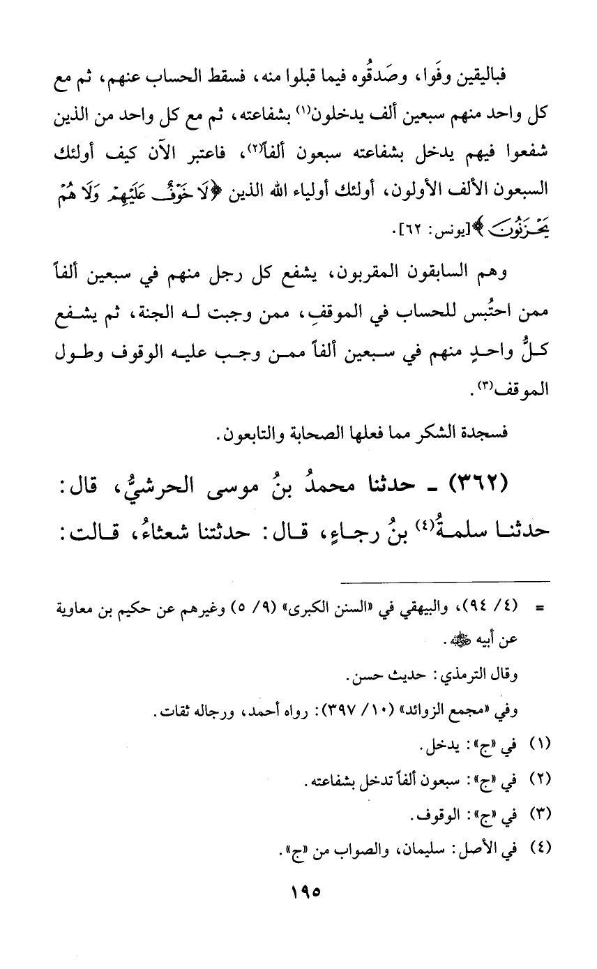 فباليقين وفوا، وصدقوه فيما قبلوا منه، فسقط الحساب عنهم، ثم مع كل واحد منهم سبعين ألف يدخلون بشفاعته، ثم مع كل واحد من الذين شفعوا فيهم يدخل بشفاعته سبعون ألفاً، فاعتبر الآن كيف أولئك السبعون الألف الأولون، أولئك أولياء الله الذين {لا خوفٌ عليهم ولا هم يحزنون}.