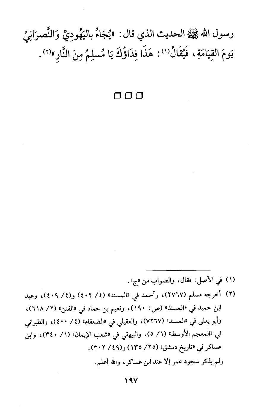 رسول الله صلى الله عليه وسلم الحديث الذي قال: ((يجاء باليهودي والنصراني يوم القيامة، فيقال: هذا فداؤك يا مسلم من النار)).