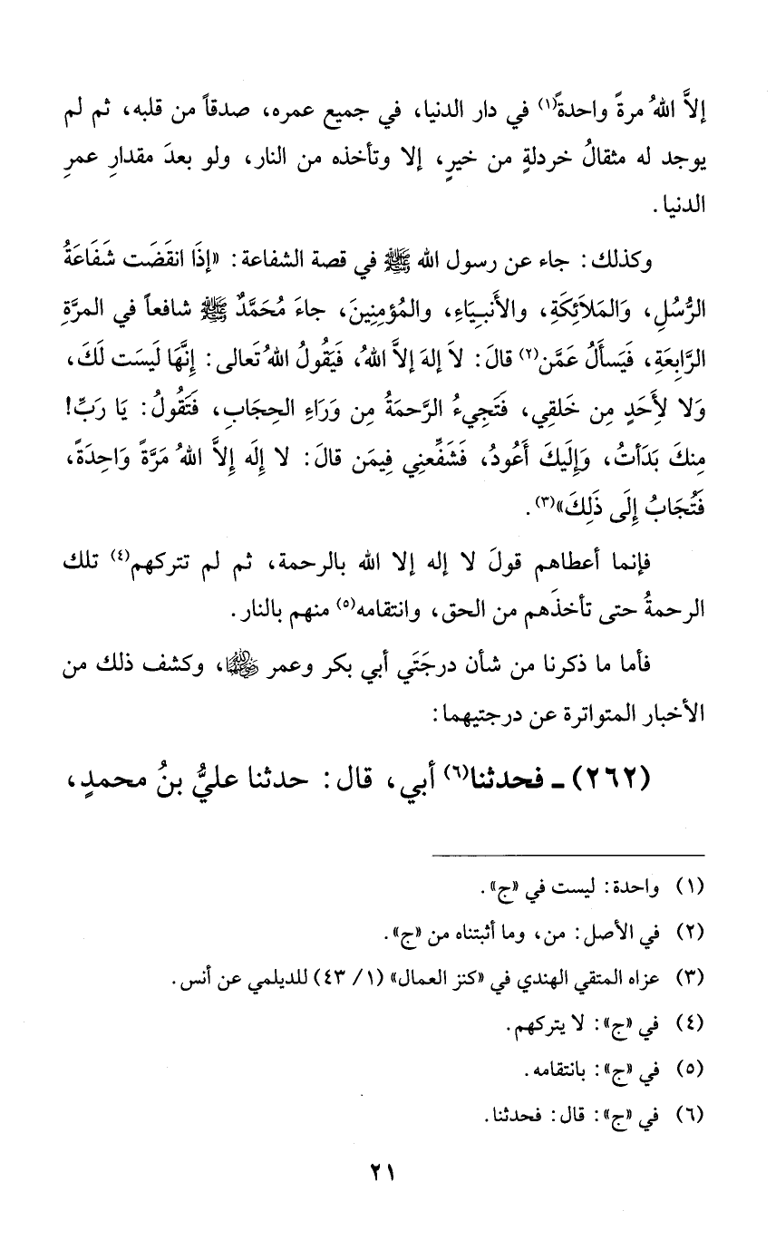 وكذلك: جاء عن رسول الله صلى الله عليه وسلم في قصة الشفاعة: ((إذا انقضت شفاعة الرسل، والملائكة، والأنبياء، والمؤمنين، جاء محمدٌ صلى الله عليه وسلم شافعاً في المرة الرابعة، فيسأل عمن قال: لا إله إلا الله، فيقول الله تعالى: إنها ليست لك، ولا لأحدٍ من خلقي، فتجيء الرحمة من وراء الحجاب، فتقول: يا رب! منك بدأت، وإليك أعود، فشفعني فيمن قال: لا إله إلا الله مرةً واحدةً، فتجاب إلى ذلك)).