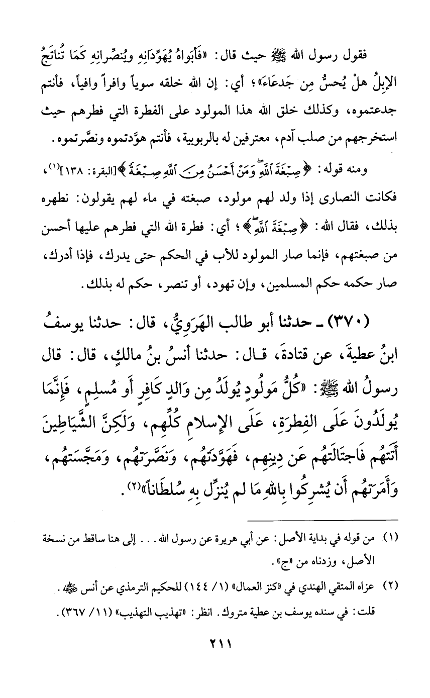 370 - حدثنا أبو طالب الهروي، قال: حدثنا يوسف ابن عطية، عن قتادة، قال: حدثنا أنس بن مالكٍ، قال: قال رسول الله صلى الله عليه وسلم: ((كل مولودٍ يولد من والدٍ كافرٍ أو مسلمٍ، فإنما يولدون على الفطرة، على الإسلام كلهم، ولكن الشياطين أتتهم فاجتالتهم عن دينهم، فهودتهم، ونصرتهم، ومجستهم، وأمرتهم أن يشركوا بالله ما لم ينزل به سلطاناً)).