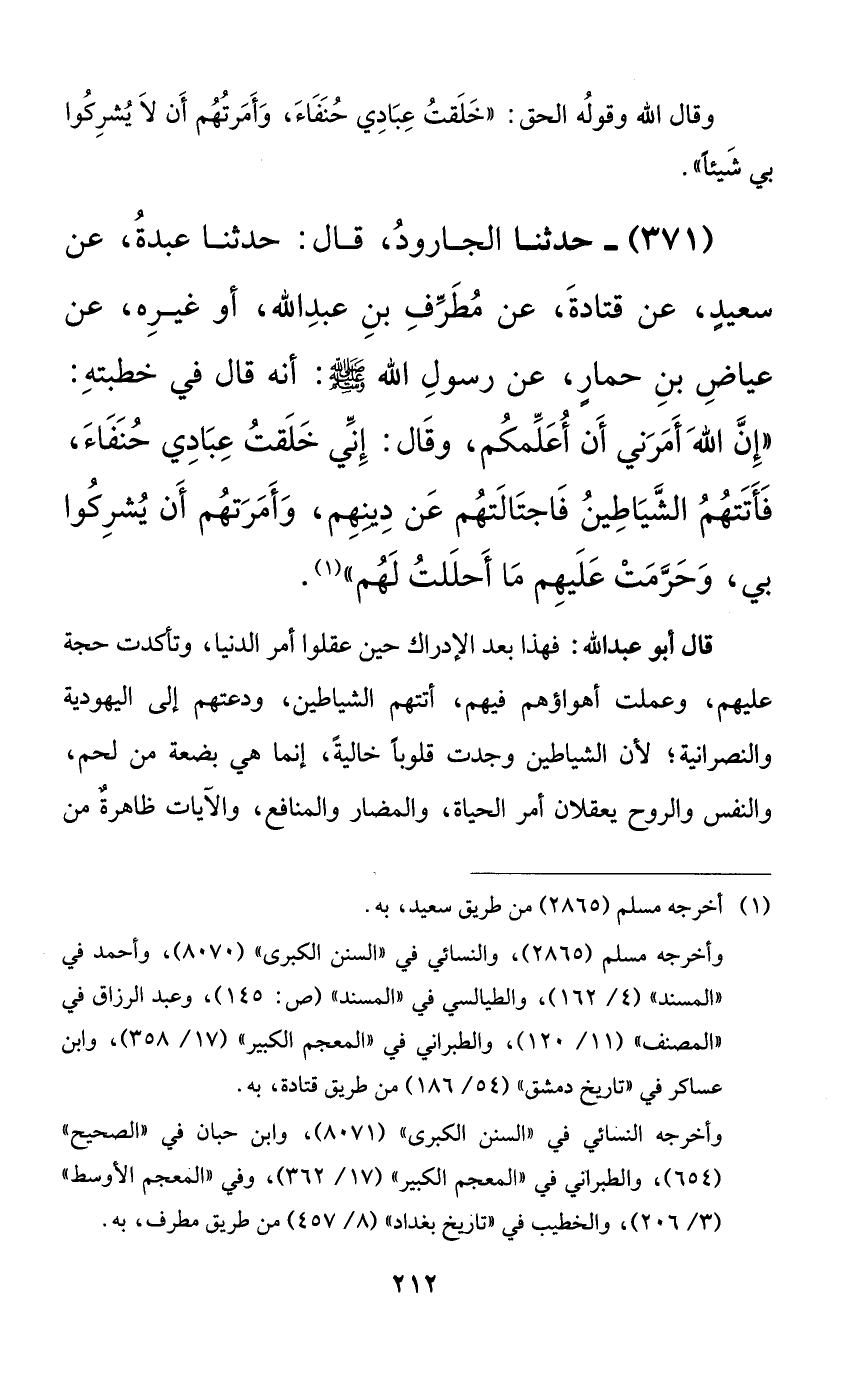 371 - حدثنا الجارود، قال: حدثنا عبدة، عن سعيدٍ، عن قتادة، عن مطرف بن عبد الله، أو غيره، عن عياضٍ بن حمارٍ، عن رسول الله صلى الله عليه وسلم: أنه قال في خطبته: ((إن الله أمرني أن أعلمكم، وقال: إني خلقت عبادي حنفاء، فأتتهم الشياطين فاجتالتهم عن دينهم، وأمرتهم أن يشركوا بي، وحرمت عليهم ما أحللت لهم)).