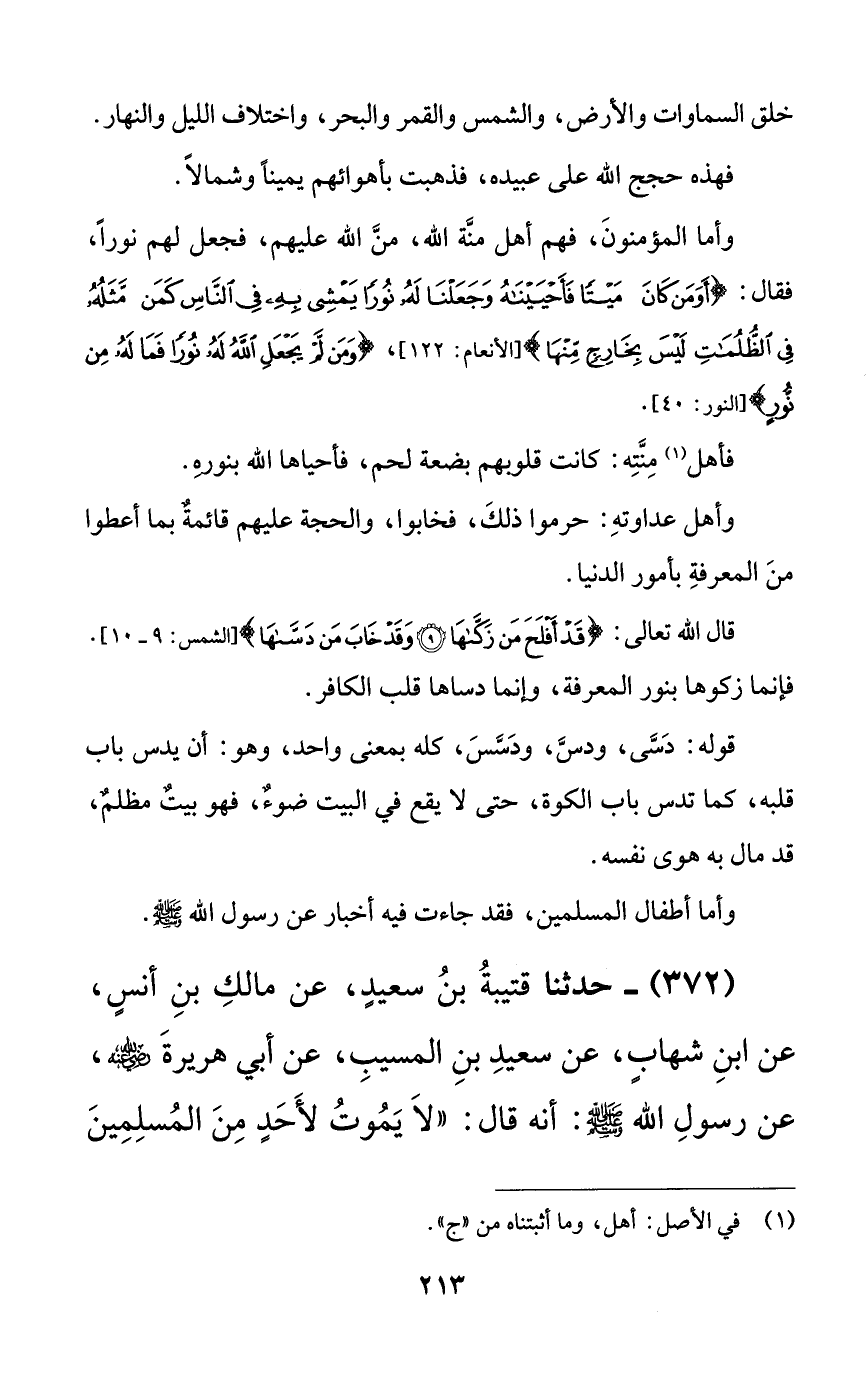 372 - حدثنا قتيبة بن سعيدٍ، عن مالك بن أنسٍ، عن ابن شهابٍ، عن سعيد بن المسيب، عن أبي هريرة رضي الله عنه عن رسول الله صلى الله عليه وسلم: أنه قال: ((لا يموت لأحدٍ من المسلمين