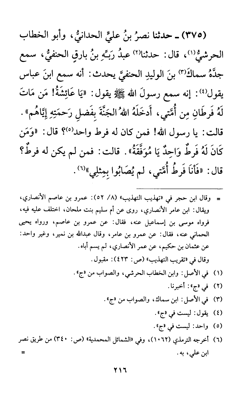 375 - حدثنا نصر بن علي الحداني، وأبو الخطاب الحرشي، قال: حدثنا عبد ربه بن بارقٍ الحنفي، سمع جده سماك بن الوليد الحنفي يحدث: أنه سمع ابن عباس يقول: إنه سمع رسول الله صلى الله عليه وسلم يقول: ((يا عائشة! من مات له فرطان من أمتي، أدخله الله الجنة بفضل رحمته إياهم)). قالت: يا رسول الله! فمن كان له فرط واحد؟ قال: ((ومن كان له فرطٌ واحدٌ يا موفقة)). قالت: فمن لم يكن له فرطٌ؟ قال: ((فأنا فرط أمتي، لم يصابوا بمثلي)).