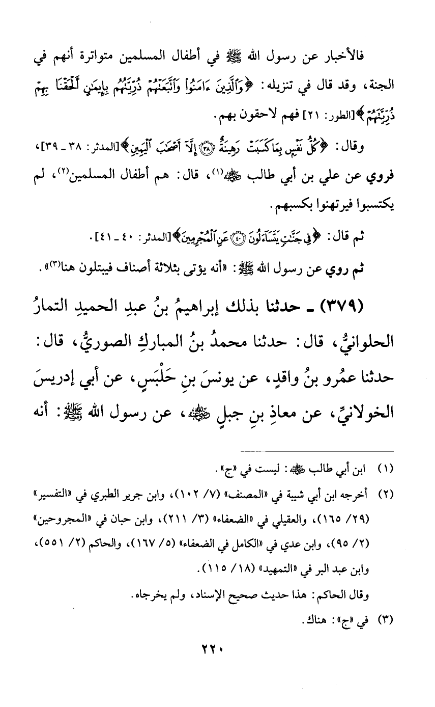 379 - حدثنا بذلك إبراهيم بن عبد الحميد التمار الحلواني، قال: حدثنا محمد بن المبارك الصوري، قال: حدثنا عمرو بن واقدٍ، عن يونس بن حلبسٍ، عن أبي إدريس الخولاني، عن معاذ بن جبلٍ رضي الله عنه، عن رسول الله صلى الله عليه وسلم: أنه