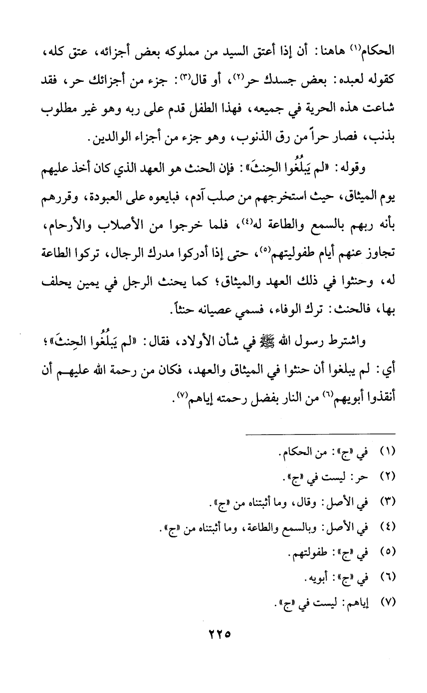 واشترط رسول الله صلى الله عليه وسلم في شأن الأولاد، فقال: ((لم يبلغوا الحنث))؛ أي: لم يبلغوا أن حنثوا في الميثاق والعهد، فكان من رحمة الله عليهم أن أنقذوا أبويهم من النار بفضل رحمته إياهم.